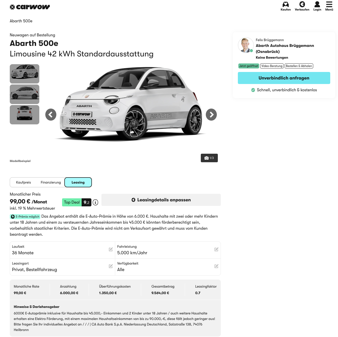 Kompakter Elektroflitzer mit klarer Ansage beim Preis, Abarth 500e 42 kWh bei carwow für 99 Euro brutto im Monat leasen. Das Angebot ist als Bestellfahrzeug angelegt und frei konfigurierbar, Farbe und Details lassen sich also passend zum eigenen Geschmack wählen. Die Lieferzeit liegt bei rund drei Monaten, damit ist das Ganze gut planbar.