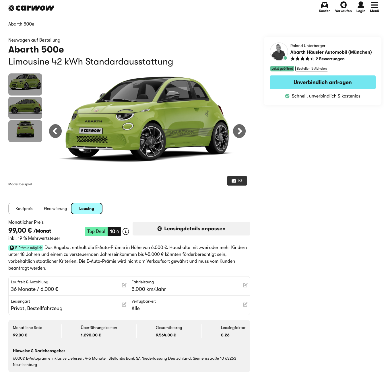 Der Abarth 500e ist kein Elektroauto für nüchterne Vernunft, sondern für alle, die auch im Kleinwagenformat etwas mehr Charakter suchen. Abarth 500e 42 kWh bei carwow für 99 Euro brutto im Monat klingt zunächst nach einem ausgesprochen günstigen Einstieg in die elektrische Hot Hatch Welt. Gleichzeitig lohnt sich gerade bei diesem Angebot ein genauer Blick auf die Berechnung, denn die niedrige Rate entsteht durch eine eingerechnete Sonderzahlung von 6.000 Euro, die auf der möglichen Umweltprämie basiert. Angeboten wird ein frei konfigurierbares Bestellfahrzeug mit einer Lieferzeit von rund drei Monaten, wodurch Farbe, Details und Auftritt nicht vorgegeben sind, sondern individuell gewählt werden können.