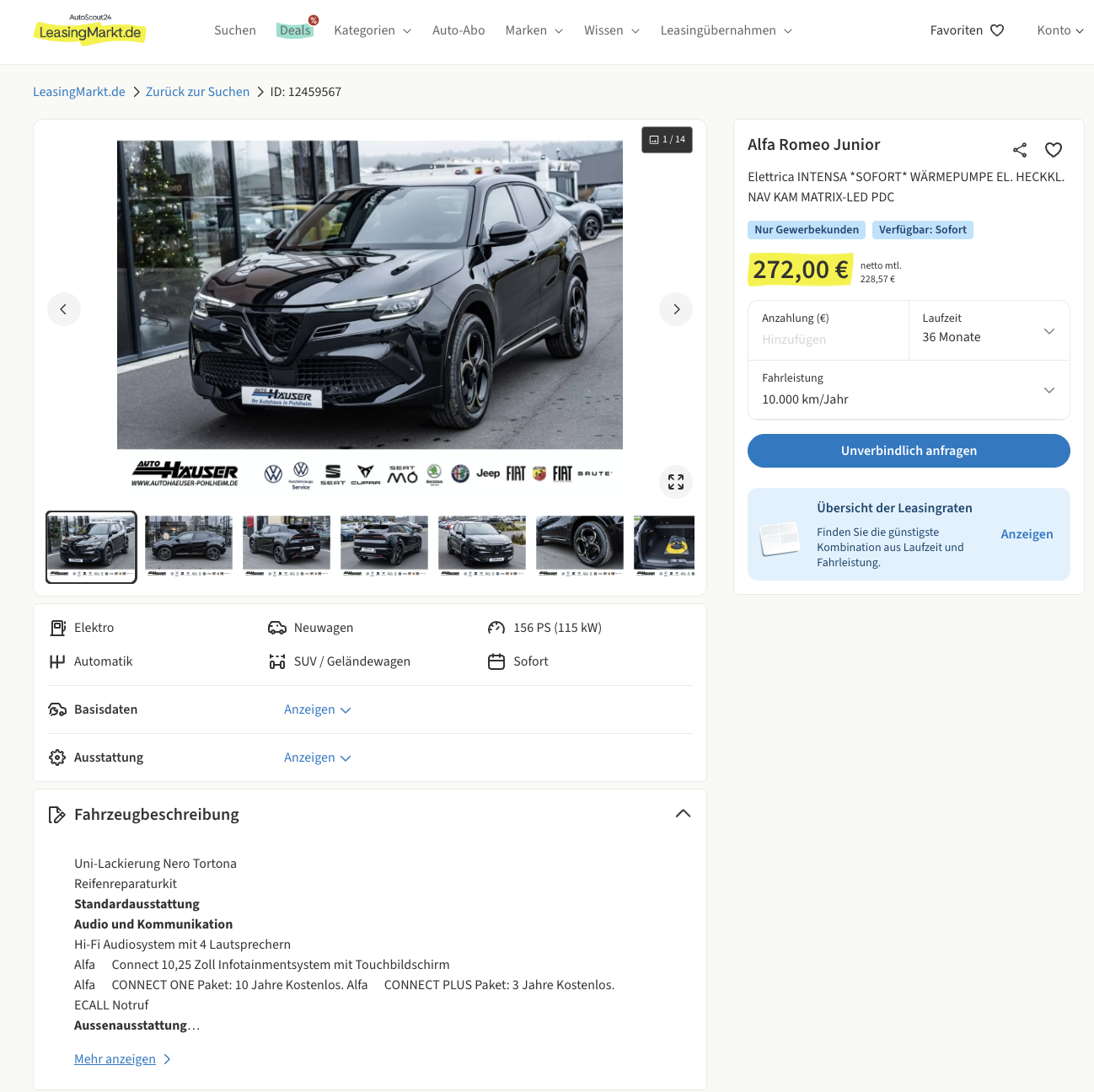 Kalkuliert ist das Angebot mit einer Laufzeit von 36 Monaten und 10.000 Kilometern Laufleistung pro Jahr. Alfa Romeo ist beim Platzhirsch aktuell nicht gelistet, damit ist das hier ein Deal abseits der üblichen Standardangebote.