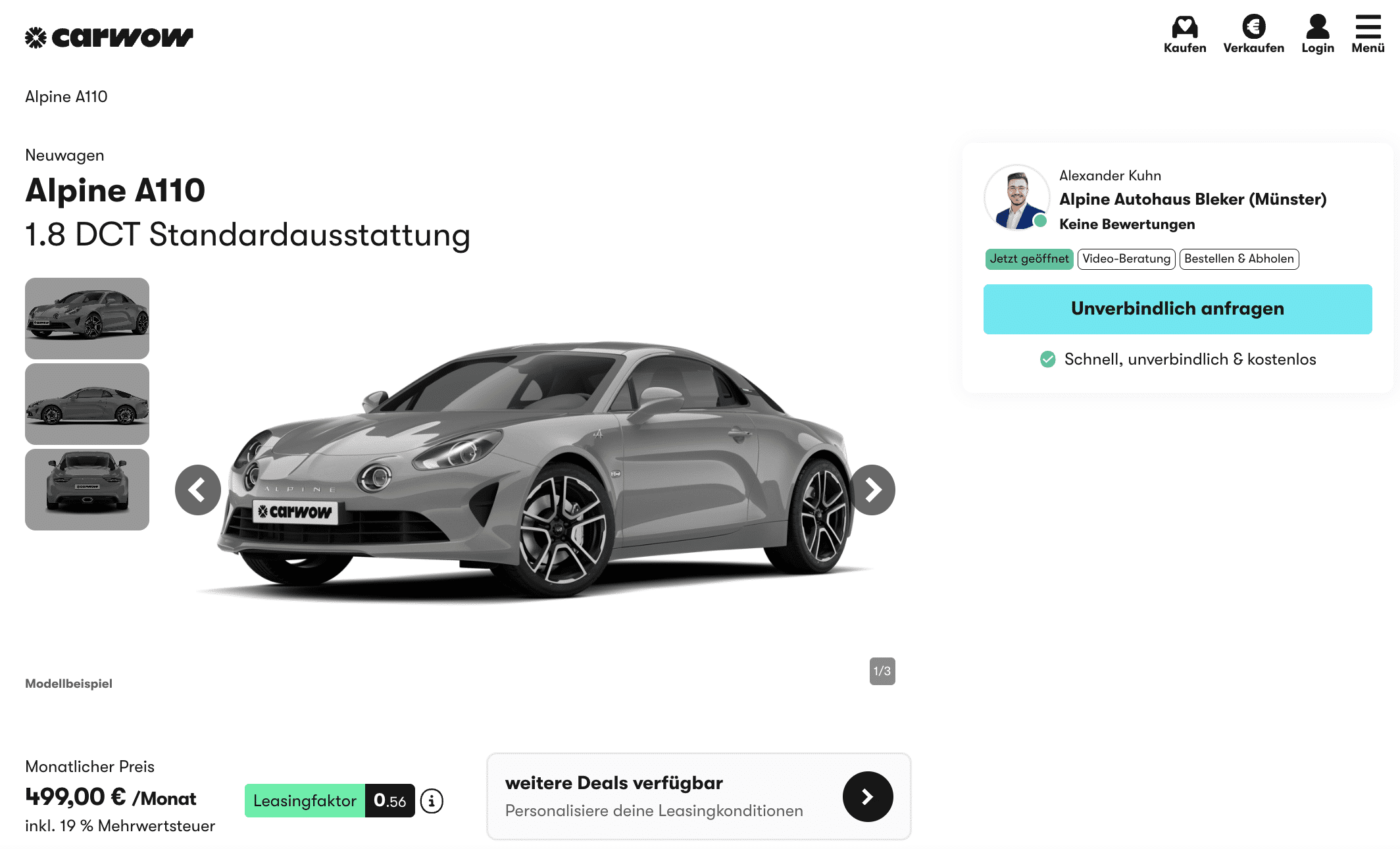 Der Marktführer hat die Marke Alpine nicht in seinem Repertoire. Bei Carwow gilt dieses Angebot über 48 Monate mit 10.000 Kilometern im Jahr.