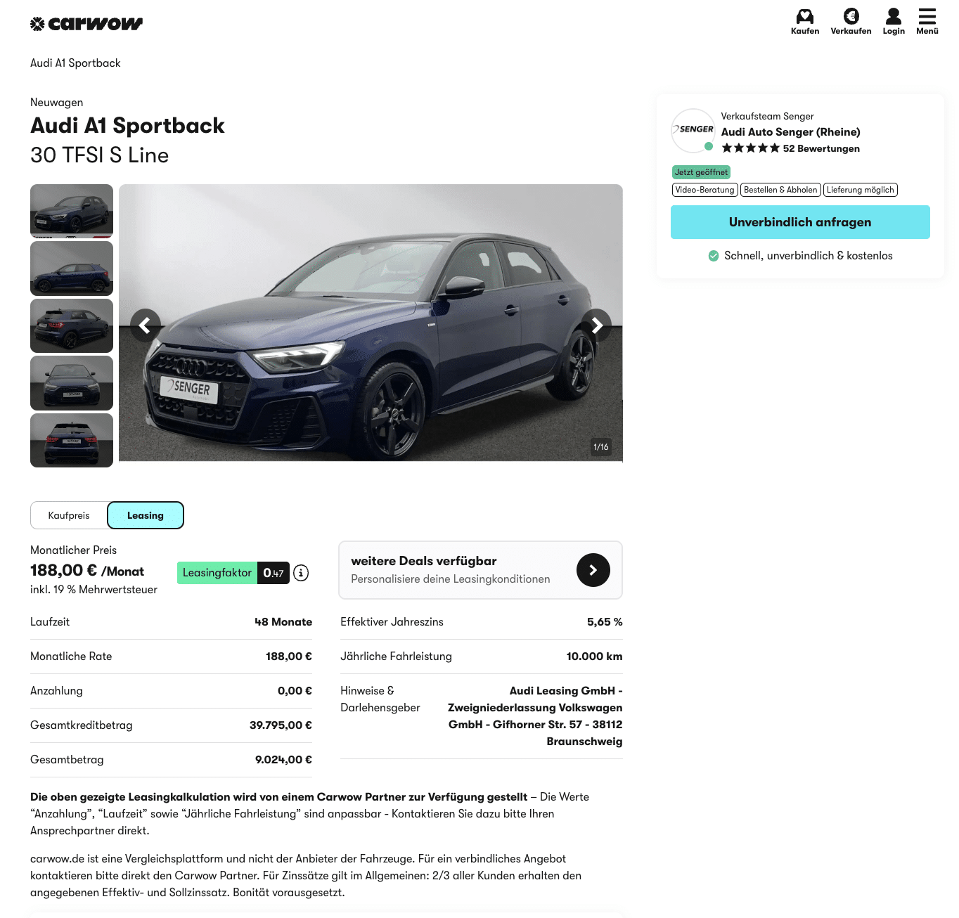Die Konditionen bleibt transparent, 48 Monate, 10.000 km pro Jahr, 188 Euro brutto monatlich. Im direkten Vergleich wird es deutlich, denn der Platzhirsch verlangt 336 Euro brutto für eine ähnliche Konfiguration.