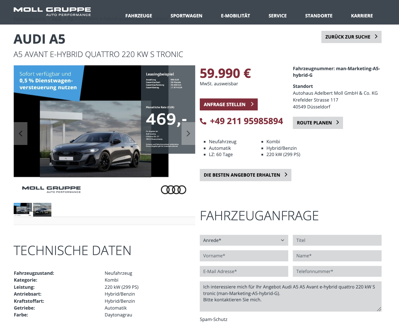 Der Audi A5 Avant e-hybrid 220 kW S tronic quattro ist die passende Wahl für alle, die einen hochwertigen Kombi mit moderner Antriebstechnik suchen. Er verbindet elektrisches Fahren im Alltag mit der Sicherheit und Reichweite eines klassischen Antriebs. Audi A5 Avant e-hybrid 220 kW bei Autohaus Moll für 469 Euro netto pro Monat ist als Geschäftsleasingangebot klar positioniert. Es handelt sich um einen sofort verfügbaren Lagerwagen in Daytonagrau Perleffekt. Kalkuliert wurde das Angebot mit 990 Euro Sonderzahlung, woraus sich eine normalisierte Leasingrate von 496,50 Euro netto ergibt. Für Geschäftskunden kommt zusätzlich die 0,5-Prozent-Versteuerung zum Tragen.
