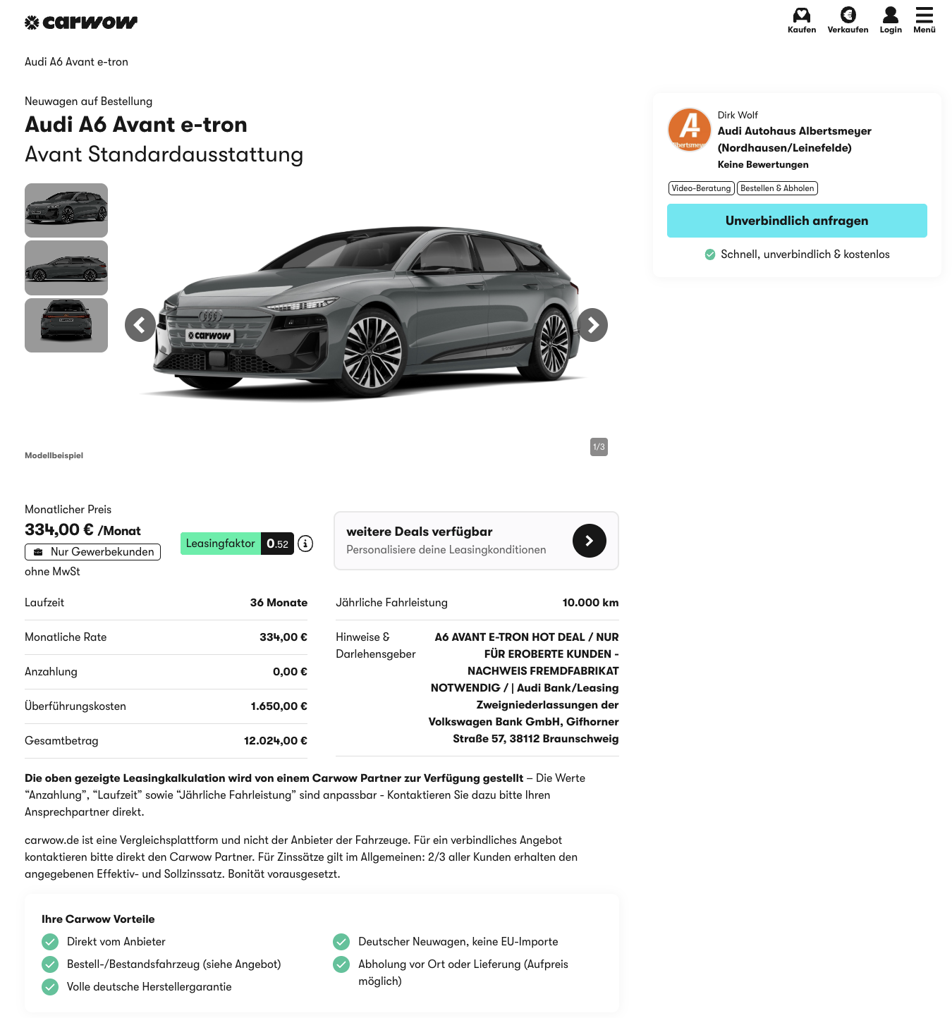 Ein Elektrokombi, der Premium, Alltag und Tempo beim Laden zusammenbringt. Audi A6 Avant e-tron bei carwow für 334 Euro netto pro Monat im Geschäftsleasing, inklusive Eroberungsprämie, der Vertragsabschluss läuft über ein Partner Autohaus, dafür braucht ihr den Fahrzeugschein einer Fremdmarke als Nachweis. Als Bestellfahrzeug könnt ihr den Kombi frei konfigurieren.