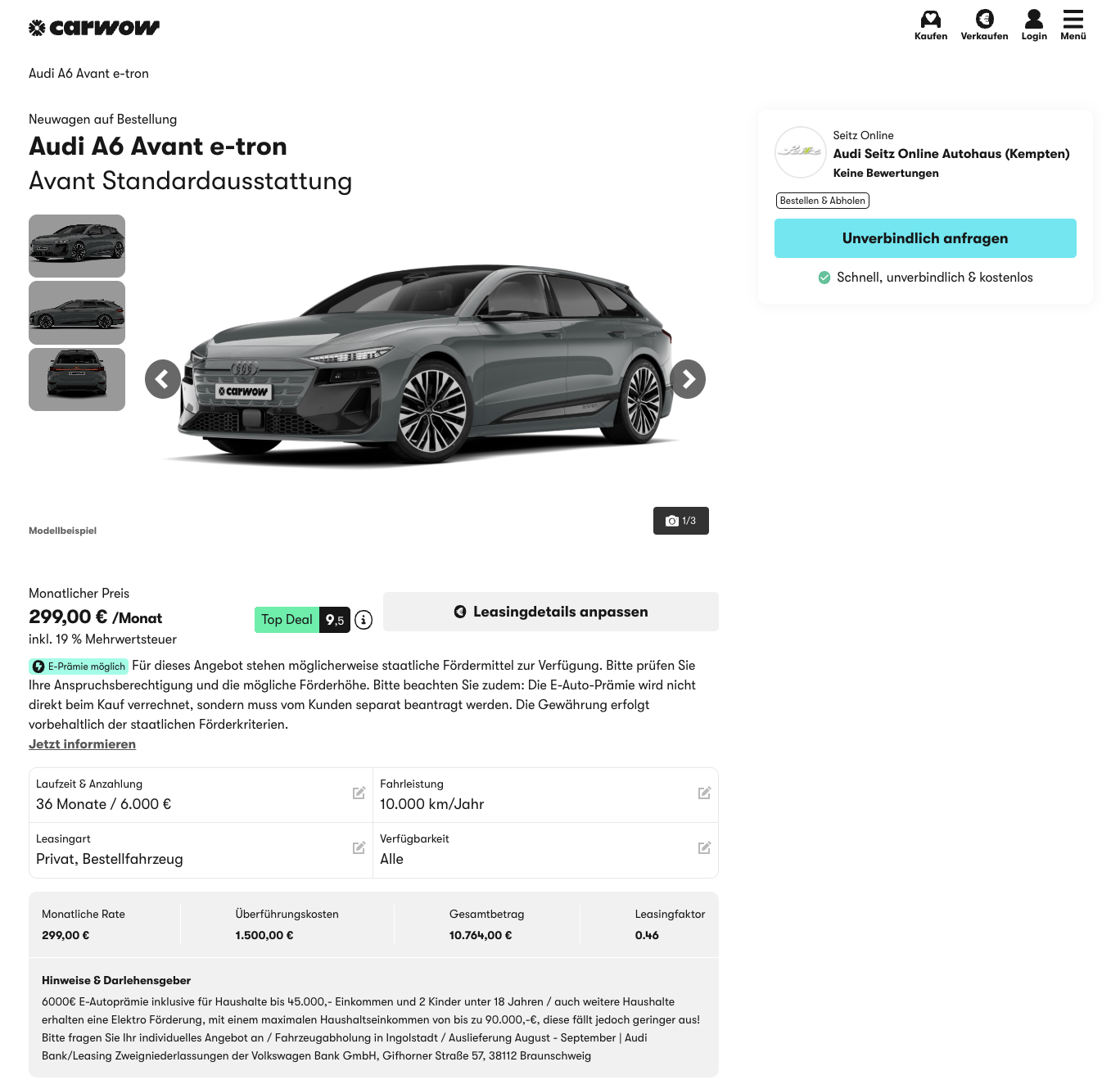 Ein elektrischer Kombi mit viel Reichweite und viel Platz, genau das bringt der Audi A6 Avant e-tron bei carwow für 299 Euro brutto im Monat mit. Gerechnet wurde das Angebot mit einer Anzahlung von 6.000 Euro, die als angesetzte Umweltprämie dient. Je nach Förderfähigkeit kann dieser Betrag ganz oder teilweise erstattet werden. Verteilt man die Anzahlung auf die Laufzeit ergibt sich daraus eine normalisierte Rate von 466 Euro brutto im Monat. Das Fahrzeug ist frei konfigurierbar, die Auslieferung ist für August 2026 geplant.