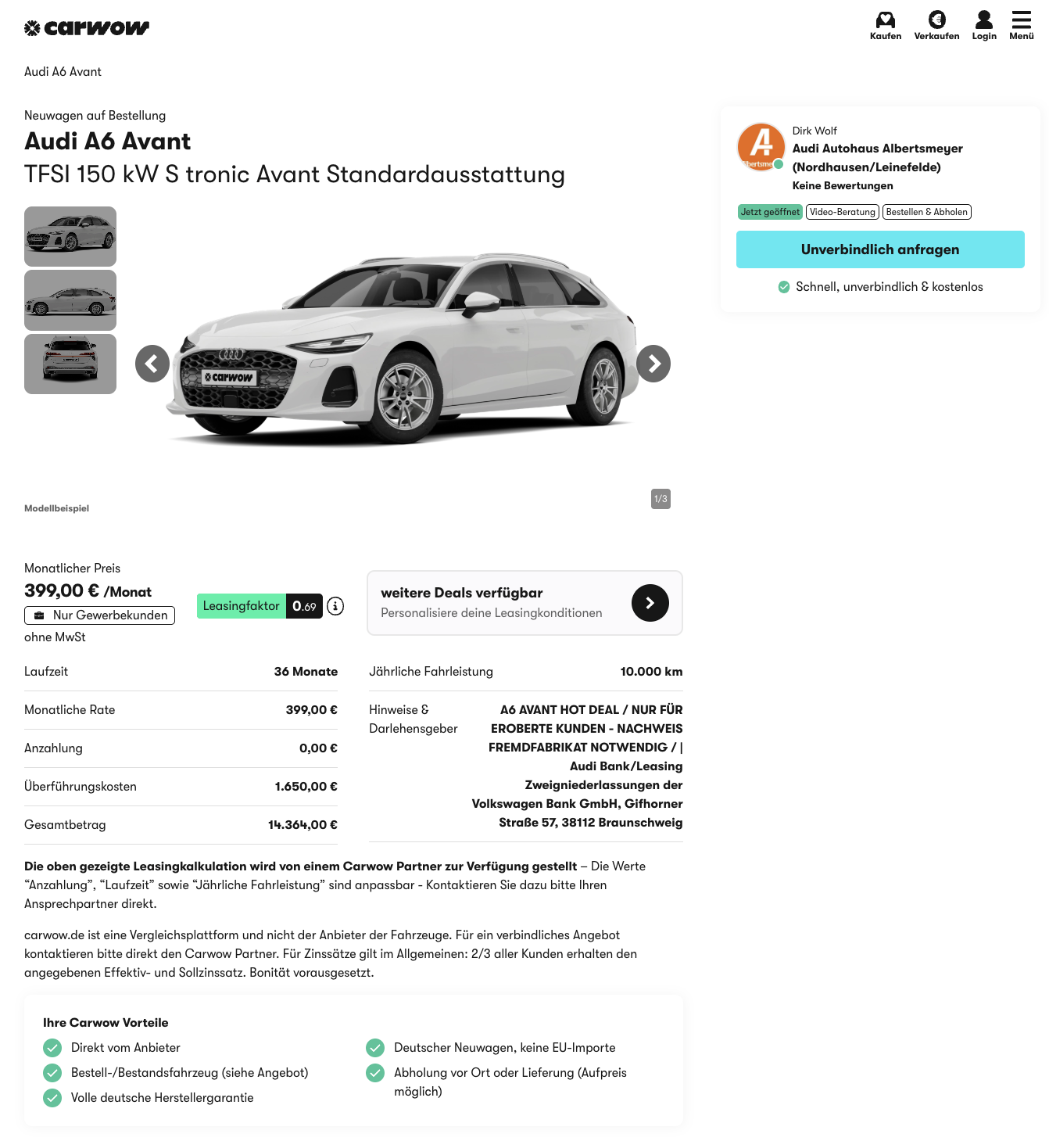 Im direkten Vergleich liegt der Marktführer mit 534 Euro netto pro Monat deutlich höher. Mit 399 Euro netto für den A6 Avant TFSI bei carwow und der Option auf die Edition One ergibt sich ein Geschäftswagen, der repräsentativ wirkt, voll langstreckentauglich ist und in der Kalkulation trotzdem auf dem Boden bleibt.