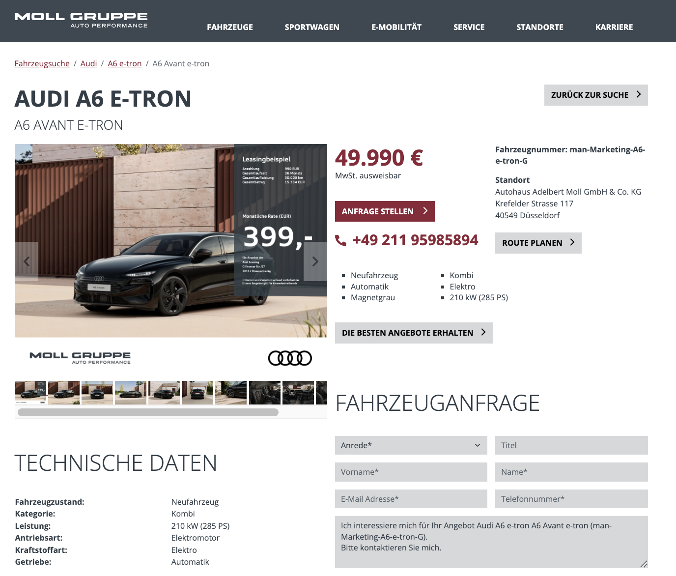 Souverän, leise und für lange Strecken gebaut, der Audi A6 e-tron Avant passt perfekt in den Fuhrpark, wenn ein repräsentativer Kombi gesucht wird, der elektrisch fährt, aber nicht nach Kompromiss aussieht. Audi A6 e tron Avant beim Autohaus Moll für 399 Euro netto im Monat ist dabei die konkrete Ansage, und die Konditionen bleiben transparent, weil die Anzahlung bei 990 Euro liegt. Wer die Sonderzahlung auf die Laufzeit verteilt, landet bei einer normalisierten Leasingrate von 426,50 Euro netto. Es handelt sich um ein frei konfigurierbares Bestellfahrzeug, die Lieferzeit wird mit rund vier Monaten angegeben, was die Planung deutlich einfacher macht als bei vielen anderen E Modellen in dieser Klasse.
