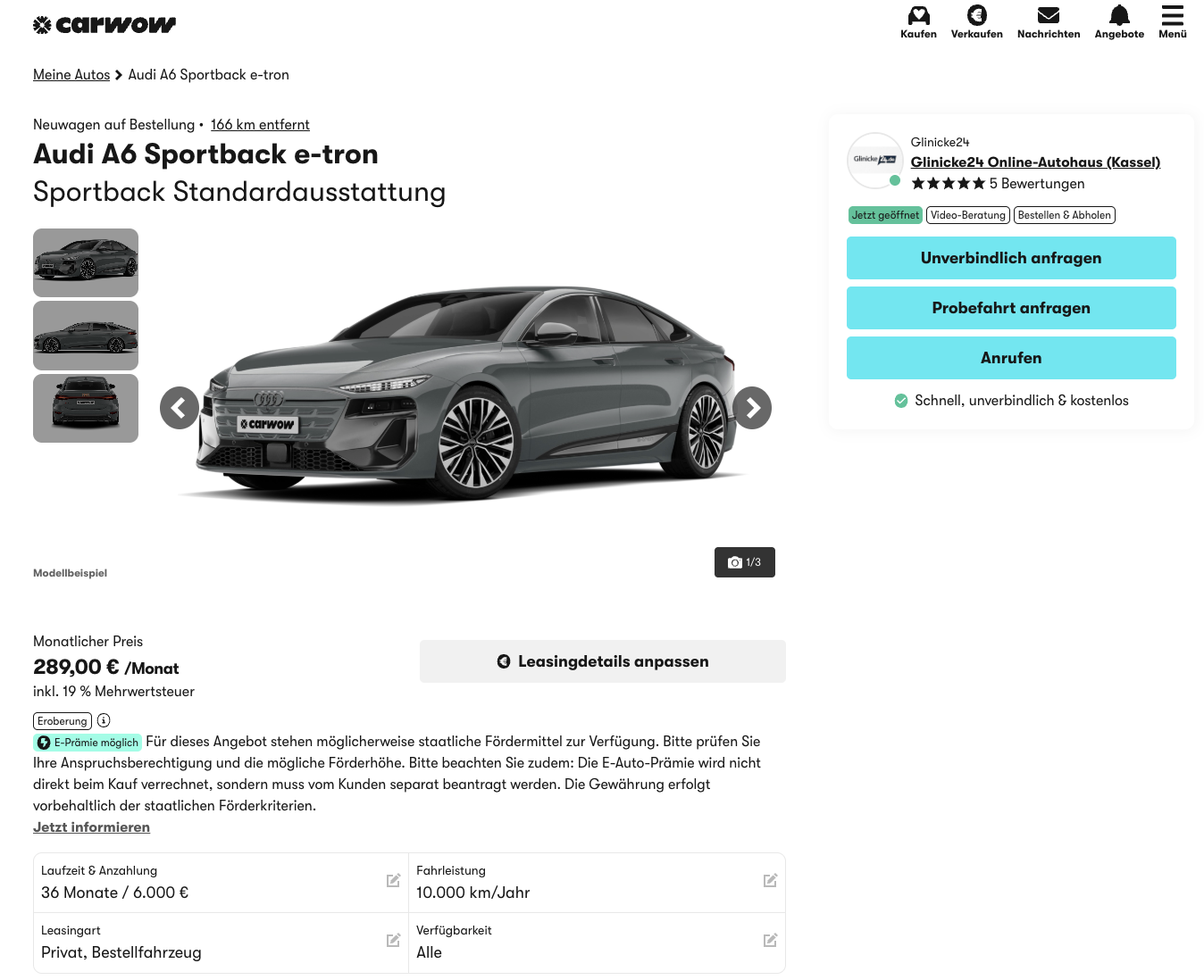 Ein Audi der oberen Mittelklasse für unter 300 Euro im Monat klingt zunächst eher nach Rechenfehler als nach realem Leasingangebot. Genau deshalb lohnt sich hier ein genauer Blick. Audi A6 Sportback e-tron bei carwow für 289 Euro brutto im Monat bringt ein vollelektrisches Modell mit Business-Anspruch in einen Preisbereich, der im aktuellen Marktumfeld deutlich Aufmerksamkeit verdient. Die Kalkulation basiert auf 6.000 Euro Anzahlung, angesetzt als mögliche Umweltprämie. Wer diesen Betrag sauber auf die Laufzeit umlegt, landet bei einer normalisierten Leasingrate von 455,67 Euro brutto pro Monat. Das Fahrzeug ist frei konfigurierbar und soll nach Bestellung in rund drei Monaten ausgeliefert werden. Alternativ steht auch der Audi A6 e-tron performance Sportback S line business für 379 Euro brutto monatlich bereit, ebenfalls bei identischer Sonderzahlung.