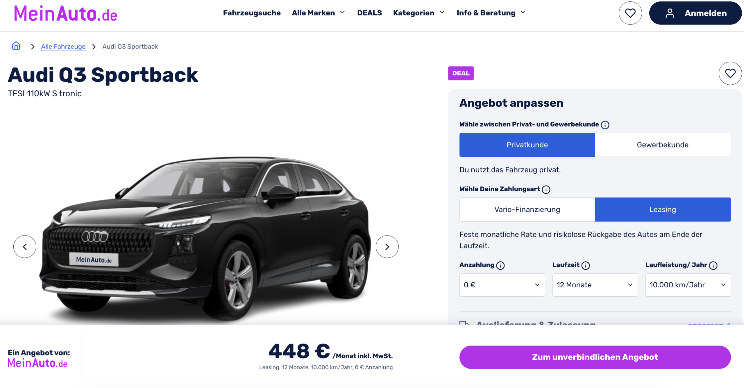 Audi Q3 Sportback im Leasing als Vorlauffahrzeug für 448 Euro im Monat brutto