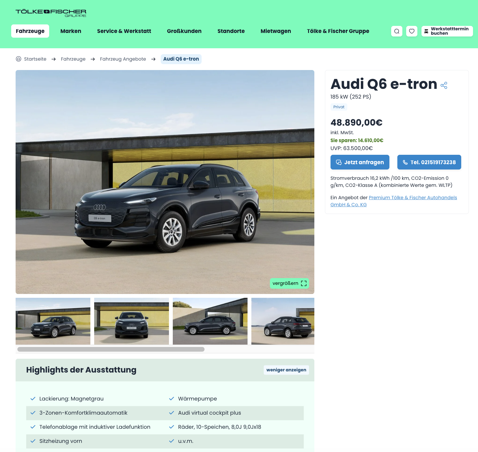 Elektrischer Premium Auftritt mit spürbarem Rabatt. Audi Q6 e-tron bei Tölke+Fischer für 48.890 Euro im Kaufdeal, frei konfigurierbar und mit 14.610 Euro Preisvorteil gegenüber dem Listenpreis von 63.500 Euro. Es handelt sich um eine Bestellaktion, ihr stellt euch euren Q6 e-tron also selbst zusammen, von der Lackierung über die Felgen bis zu den Ausstattungspaketen.