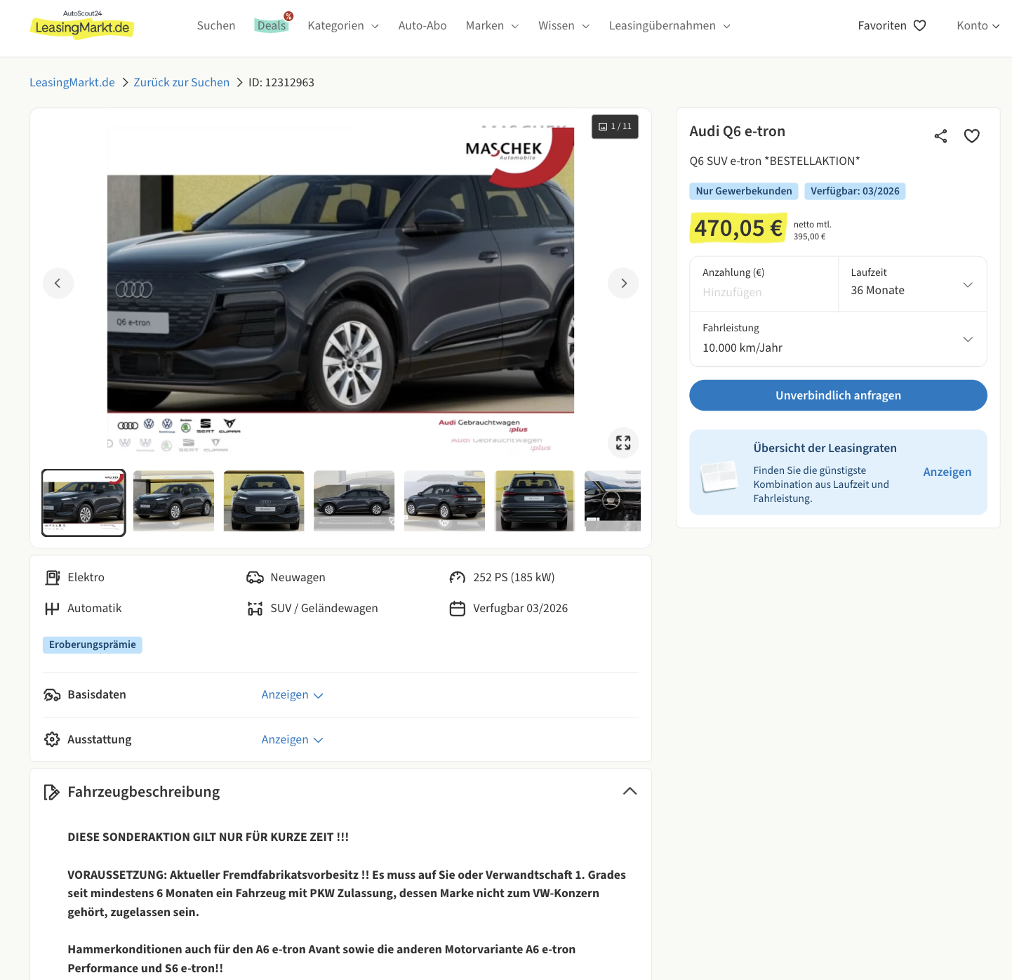 Ein modernes E-SUV, das Premium und schnelles Laden sauber verbindet. Audi Q6 e-tron bei carwow für 375 Euro brutto im Monat im Geschäftsleasing, als Eroberungsangebot für alle, die aktuell keinen Audi fahren. Für die Eroberungsprämie braucht ihr den Nachweis eines Fremdfabrikats, dazu kommt der Vorteil einer freien Konfiguration als Bestellfahrzeug, die Lieferzeit liegt bei rund drei Monaten.