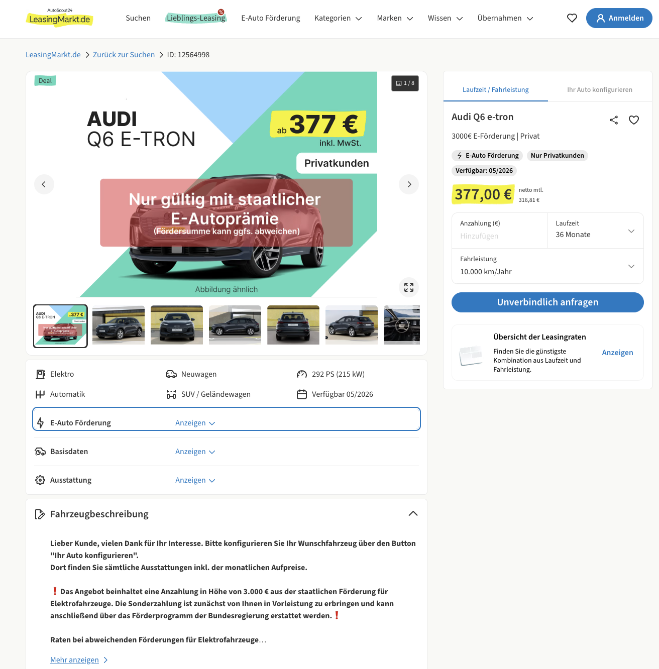 Der Audi Q6 e-tron markiert Audis nächsten großen Schritt in der Elektromobilität. Privatkunden können den Audi Q6 e-tron aktuell bei LeasingMarkt für 377 Euro brutto pro Monat leasen, kalkuliert mit 3.000 Euro Sonderzahlung in Form der erstattungsfähigen Umweltprämie, 36 Monate Laufzeit und 10.000 Kilometer pro Jahr. Es handelt sich um ein frei konfigurierbares Bestellfahrzeug, Farbe, Ausstattung und Details lassen sich also exakt auf den eigenen Bedarf abstimmen.