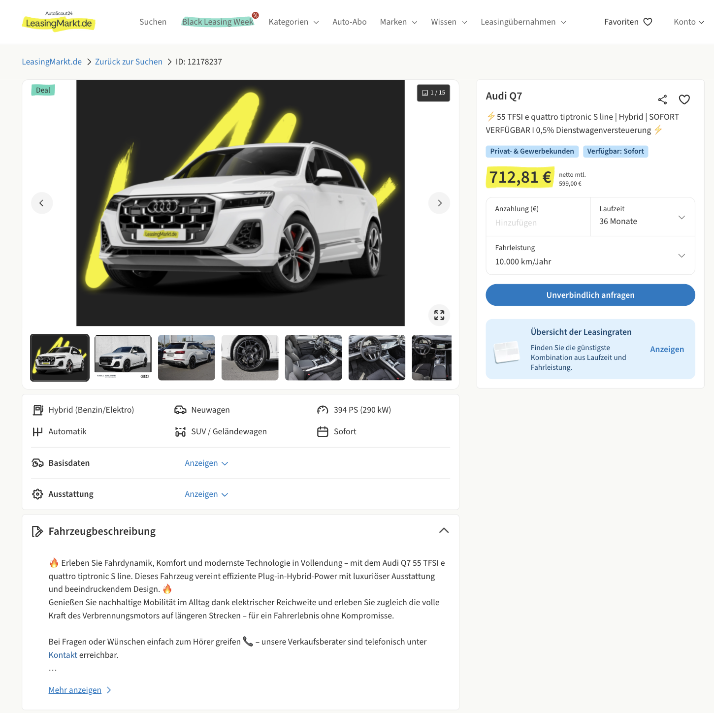 Kalkuliert wurde das Angebot mit einer Laufzeit von 36 Monaten und 10.000 Freikilometer pro Jahr und lässt sich bei Bedarf anpassen. Der entscheidende Punkt ist der Preisvergleich, denn für einen Audi Q7 mit ähnlicher Ausstattung ruft der Marktführer rund 943 Euro netto im Monat auf. Damit bietet dieses Leasing bei LeasingMarkt einen klaren Kostenvorteil, ohne bei Motor, Platz oder Ausstattung Abstriche zu verlangen.
