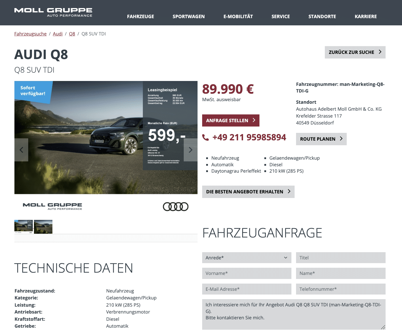 Großer Auftritt, klare Zahlen. Beim Autohaus Moll steht der Audi Q8 TDI 210 kW quattro tiptronic für 599 € netto im Monat bereit. Mit 990 € Anzahlung ergibt sich eine normalisierte Rate von 626,50 € netto. Der besondere Trumpf: sofort verfügbarer Lagerwagen, statt Warten heißt es Einsteigen. Die Beispielkalkulation läuft über 24 Monate und 10.000 km pro Jahr.