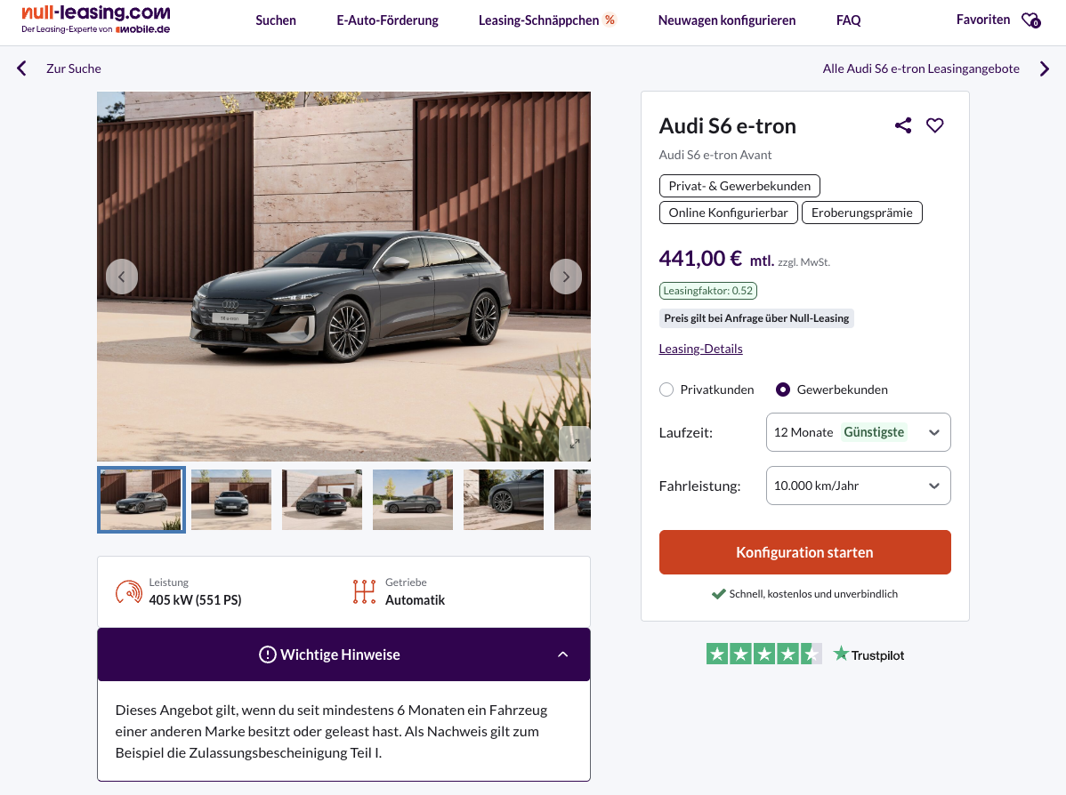 Nicht jeder elektrische Kombi muss zurückhaltend auftreten. Der Audi S6 e-tron Avant 405 kW bei Null-Leasing für 441 Euro netto im Monat richtet sich an Geschäftskunden, die einen leistungsstarken Stromer mit Premiumanspruch suchen, ohne sich direkt langfristig zu binden. Die Kalkulation basiert auf 12 Monaten Laufzeit und 10.000 Kilometern pro Jahr, Anpassungen sind möglich. Für Privatkunden liegt die Rate bei 525 Euro brutto monatlich.