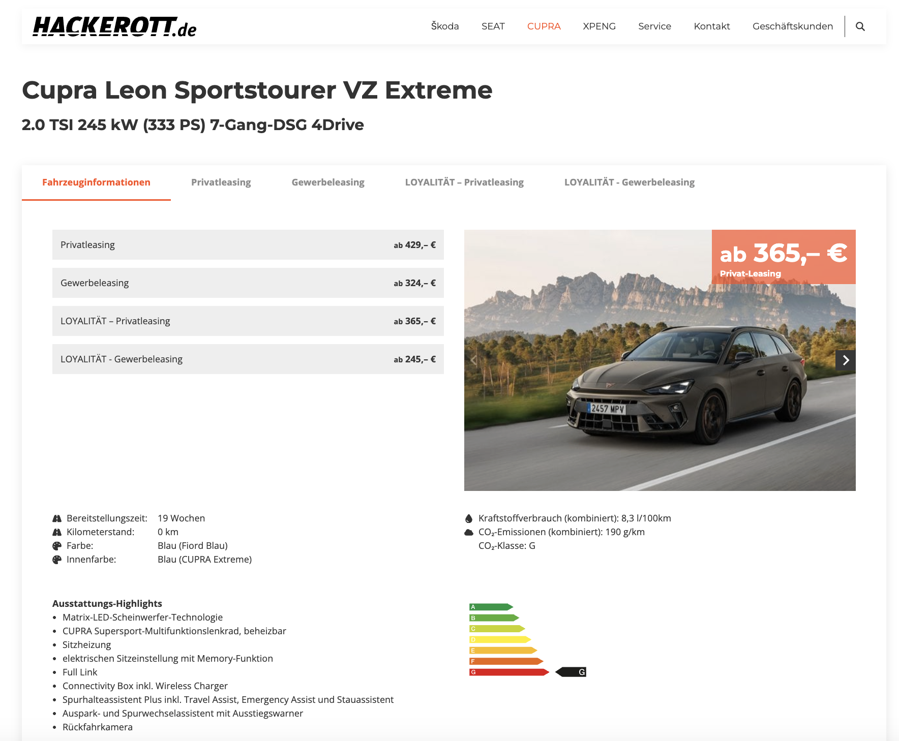 Die Black Friday Konditionen bei Hackerott sind auf 24 Monate Laufzeit und 10.000 Kilometer pro Jahr ausgelegt. 365 Euro brutto im Monat gelten für alle, die seit mindestens sechs Monaten ein Seat oder Cupra Fahrzeug im Bestand haben, unabhängig davon, ob es bar bezahlt, finanziert oder geleast wurde. Ohne diese Loyalitätsprämie steigt die Rate auf 429 Euro brutto im Monat. Im Vergleich dazu listet ein großer Marktführer einen ähnlich ausgestatteten Cupra Leon ST VZ Extreme mit über 732 Euro brutto im Monat, der Abstand zeigt den Charakter dieses Angebots: ein vollwertiger Performance Kombi mit deutlichem Black Friday Preisvorteil.