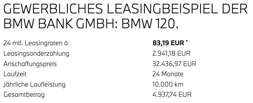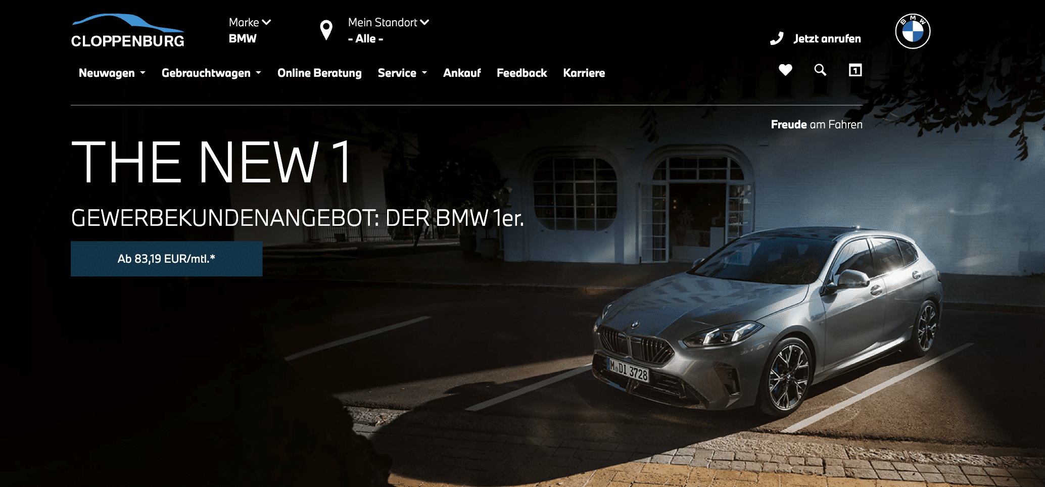 Das Beispiel ist mit 24 Monaten Laufzeit und 10.000 km pro Jahr kalkuliert. Laufzeit und Kilometer lassen sich an euer Fahrprofil anpassen; genauso individuell stellt ihr die Ausstattung zusammen – vom Business-Setup bis zum sportlichen Look. Der Blick über den Tellerrand zeigt den Vorteil glasklar: Bei gleicher Anzahlung verlangt der Marktführer 159 € netto/Monat. Das Cloppenburg-Angebot mit 83,19 € netto unterbietet das deutlich – ideal für alle, die BMW-Feeling wollen, ohne das Budget zu sprengen.