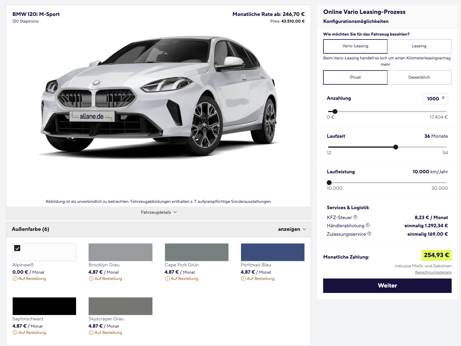 Ein Kompaktwagen kann vernünftig sein, oder er kann Charakter haben. Der BMW 120 Steptronic mit M Sport Paket bei Allane für 254,93 Euro brutto im Monat versucht, beides miteinander zu verbinden. Genau das macht dieses Angebot interessant. Es geht nicht einfach nur um einen 1er BMW im Leasing, sondern um ein Modell, das sportlichen Auftritt, moderne Technik und ein variables Finanzierungskonzept in einem Paket zusammenführt. Gerechnet wurde das Vario-Leasing mit 1.000 Euro Anzahlung, einer Laufzeit von 36 Monaten und 10.000 Kilometern pro Jahr. Der entscheidende Unterschied zum klassischen Leasing zeigt sich am Ende. Dann bleibt die Wahl offen, ob das Fahrzeug für 26.106 Euro übernommen oder gegen eine Schlusszahlung von 1.305,30 Euro zurückgegeben wird. Der BMW ist bereits bestellt und in mehreren Farben verfügbar, darunter Alpinweiß, Cape York Grün, Portimao Blau und weitere Farben. Die Lieferzeit liegt bei rund zwei Monaten.