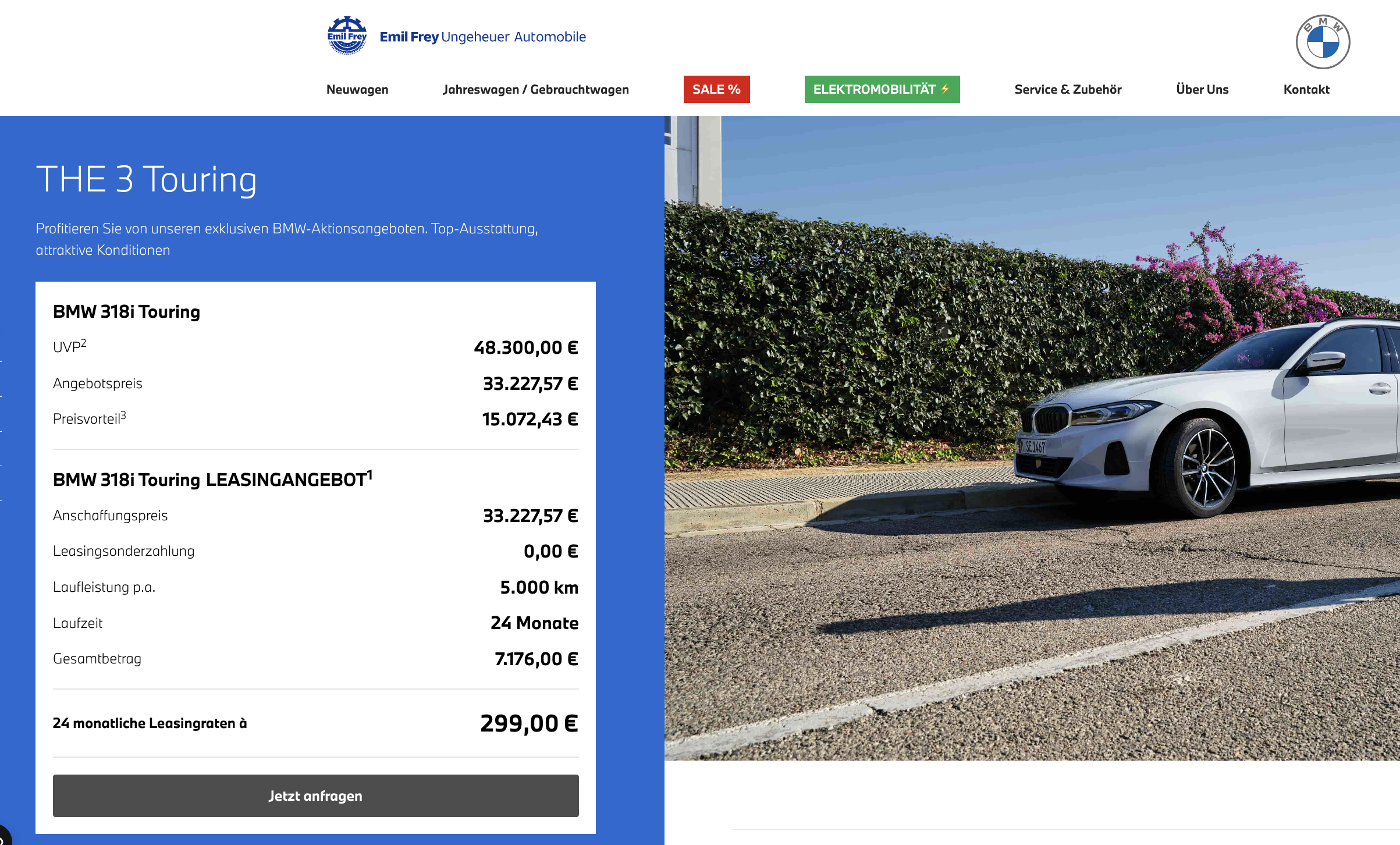Ein Kombi für Alltag und Strecke, genau dafür steht der BMW 3er Touring seit Jahren. Privatkunden können den BMW 318i Touring Automatik bei Emil Frey Ungeheuer Automobile für 299 Euro brutto im Monat bietet aktuell einen vergleichsweise günstigen Einstieg in die Premiumklasse. Das Fahrzeug wird als frei konfigurierbares Bestellmodell angeboten, sodass Ausstattung und Details individuell gewählt werden können. Zusätzlich fallen 1.270 Euro für Zulassung und Transport an. Das Angebot ist bis Ende Juni 2026 gültig.