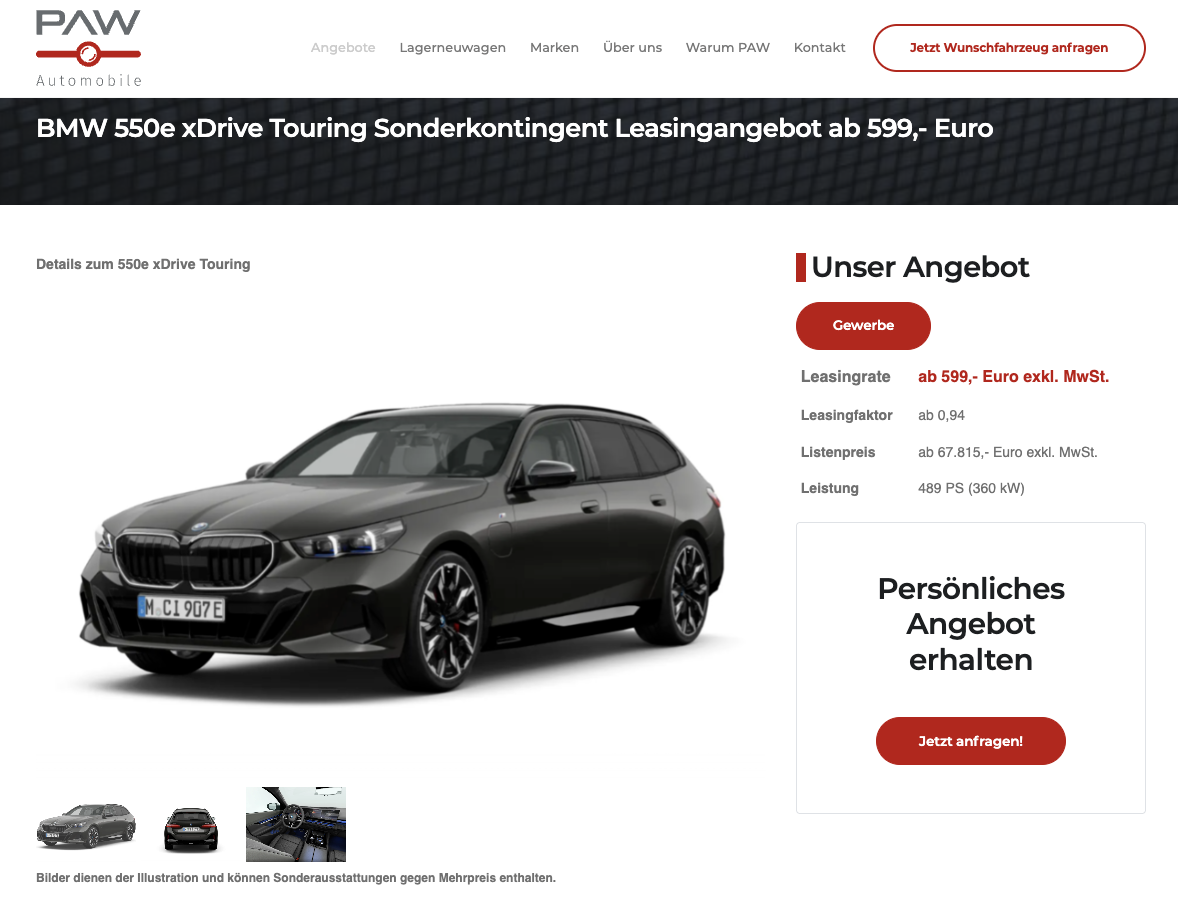 Leiser Strom, klassischer Sechszylinder, der 5er Touring neu gedacht. Bei PAW Automobile gibt es den BMW 550e xDrive Touring ab 599 Euro netto im Monat. Voraussetzung ist ein Flottenrabatt von 40 Euro, der ab vier gewerblich genutzten Fahrzeugen greift. Ohne diesen Vorteil liegt die Rate bei 639 Euro netto monatlich. Die Laufzeit beträgt 36 Monate bei 5.000 Kilometern jährlich, Anpassungen sind möglich. Bestellt wird der Touring individuell, die Lieferzeit liegt bei etwa vier Monaten.