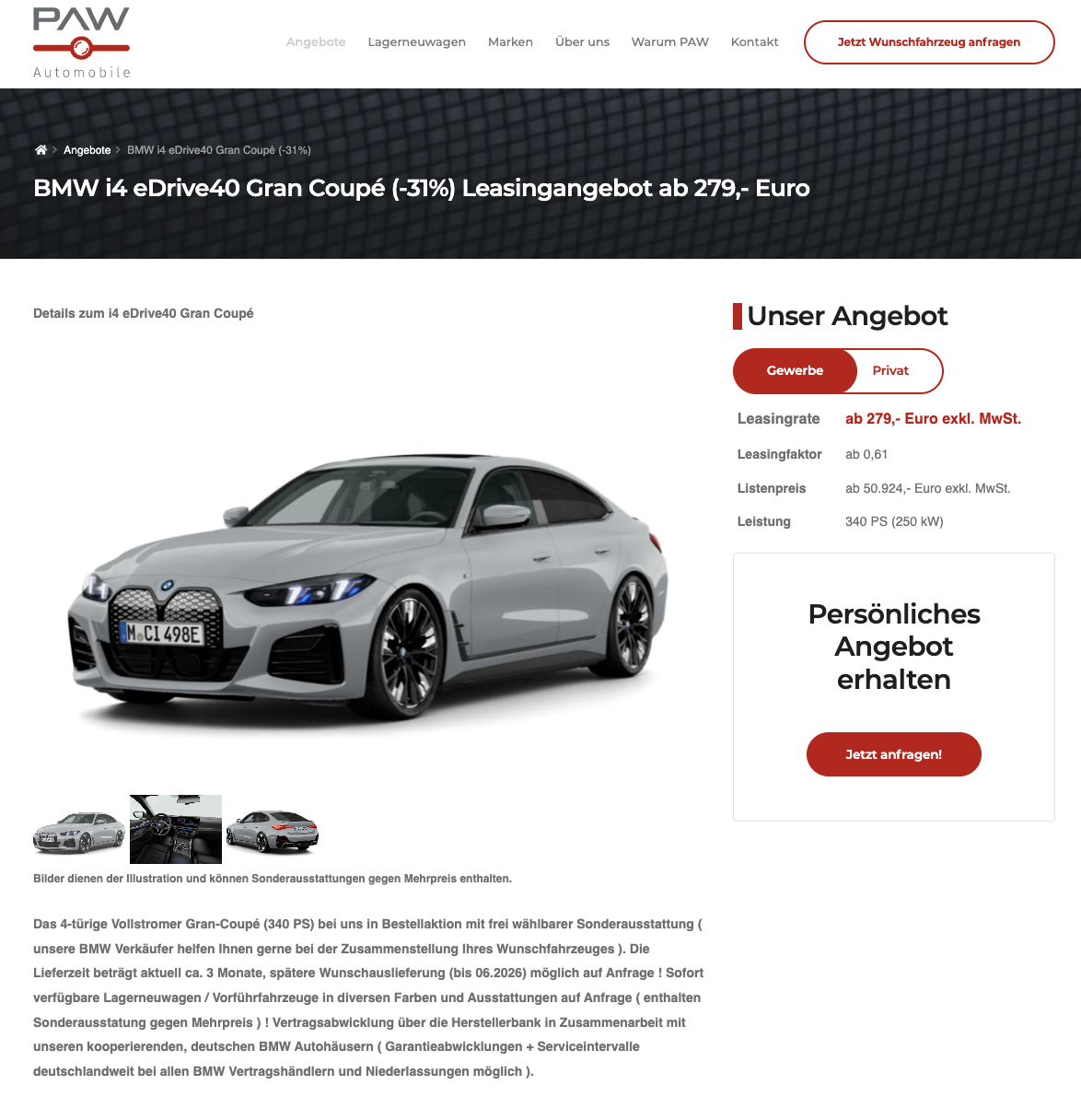 BMW i4 eDrive40 Gran Coupé bei PAW Automobile für 279 Euro netto im Geschäftsleasing oder ab 395 Euro brutto im Privatleasing. Die Berechnung startet bei 24 Monaten Laufzeit und 5.000 Kilometern pro Jahr, wer mehr unterwegs ist, landet bei nur 315 Euro netto im Monat für 10.000 Kilometer. Es handelt sich um ein frei konfigurierbares Bestellfahrzeug mit rund drei Monaten Lieferzeit, die Wunschauslieferung ist bis Juni 2026 vorgesehen, Farben, Pakete und Felgen lassen sich also in Ruhe auf den eigenen Geschmack abstimmen.
