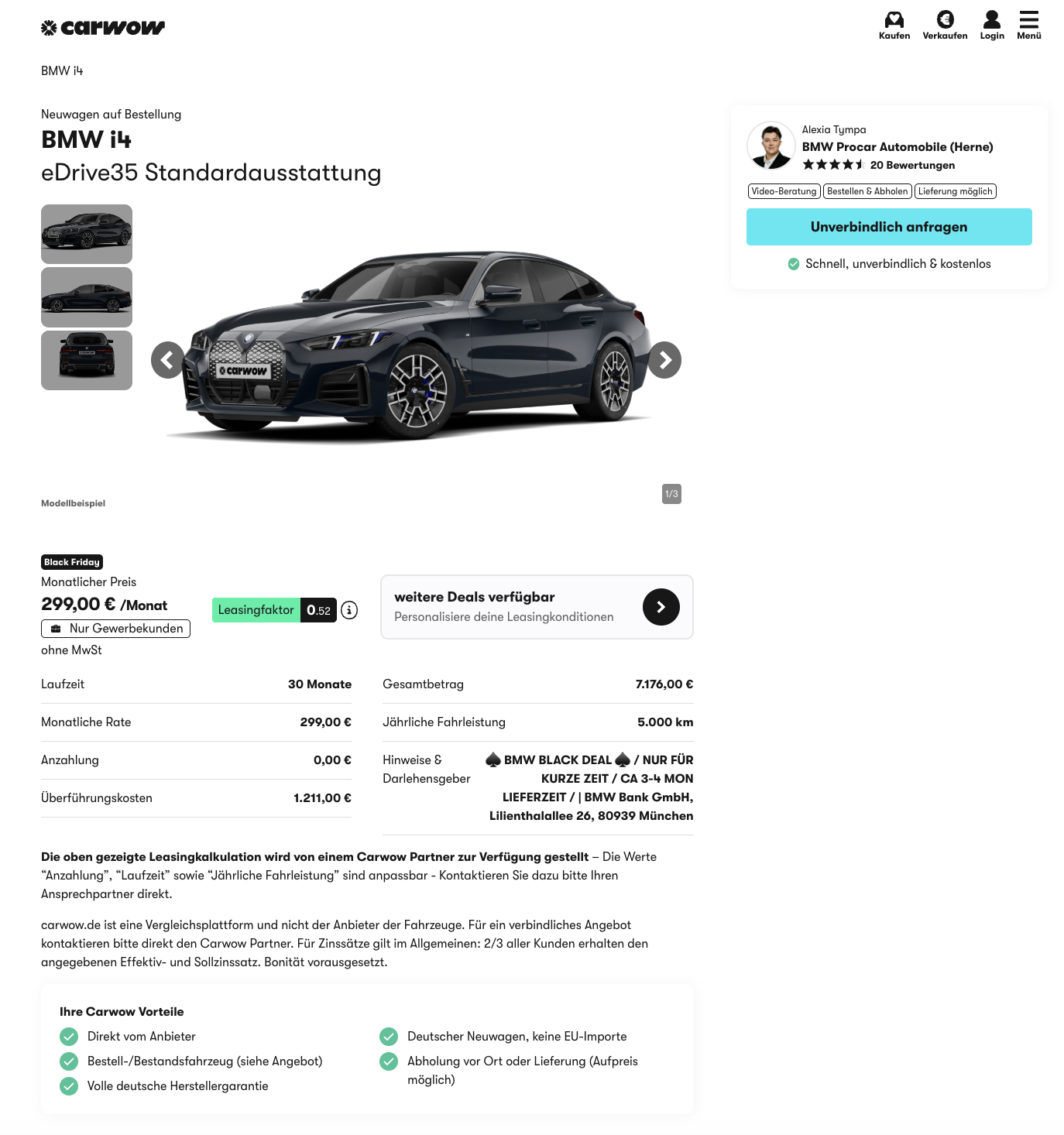Die Konditionen bei carwow sind klar gehalten: 30 Monate Laufzeit mit 5.000 Kilometern pro Jahr, auf Wunsch anpassbar, falls mehr Fahrleistung benötigt wird. Im Marktvergleich sticht das Angebot hervor, denn für das gleiche Modell werden bei anderen Anbietern aktuell bis zu 506 Euro brutto im Monat aufgerufen. Damit bietet der i4 eDrive35 bei carwow einen Einstieg in die BMW Elektrowelt, der Leistung, Reichweite und Premium Anmutung mit einer überschaubaren Leasingrate verbindet.