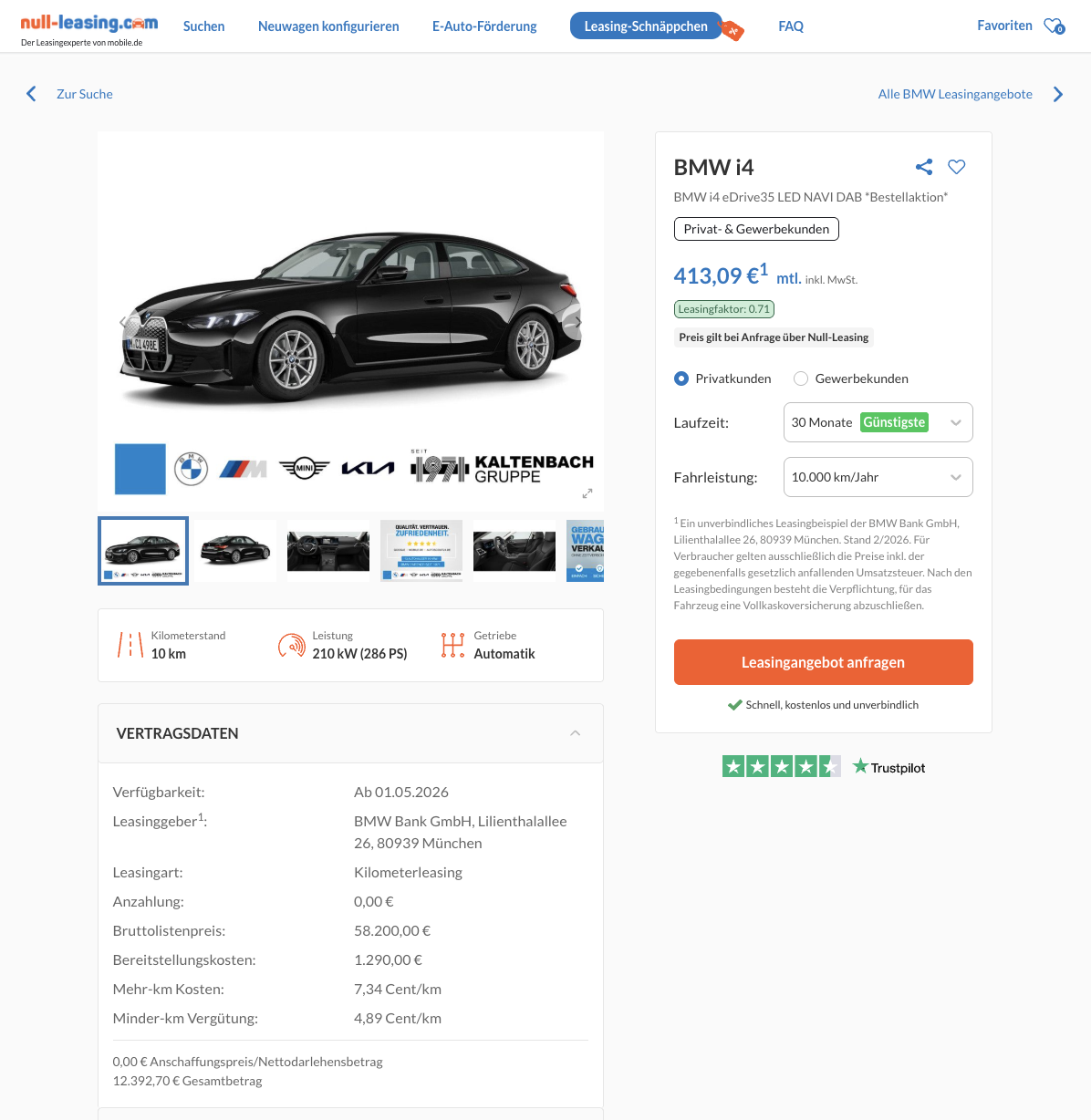 Die Beispielkalkulation basiert auf 30 Monaten Laufzeit und 10.000 Kilometern pro Jahr, Anpassungen sind in der Regel möglich. Im Vergleich werden für ähnlich motorisierte Fahrzeuge laut Angabe bis zu 634 Euro brutto pro Monat verlangt. Mit 413,09 Euro brutto liegt dieses Angebot deutlich darunter und eignet sich für alle, die ein BMW i4 eDrive35 Leasing planbar und individuell konfigurierbar aufsetzen möchten.