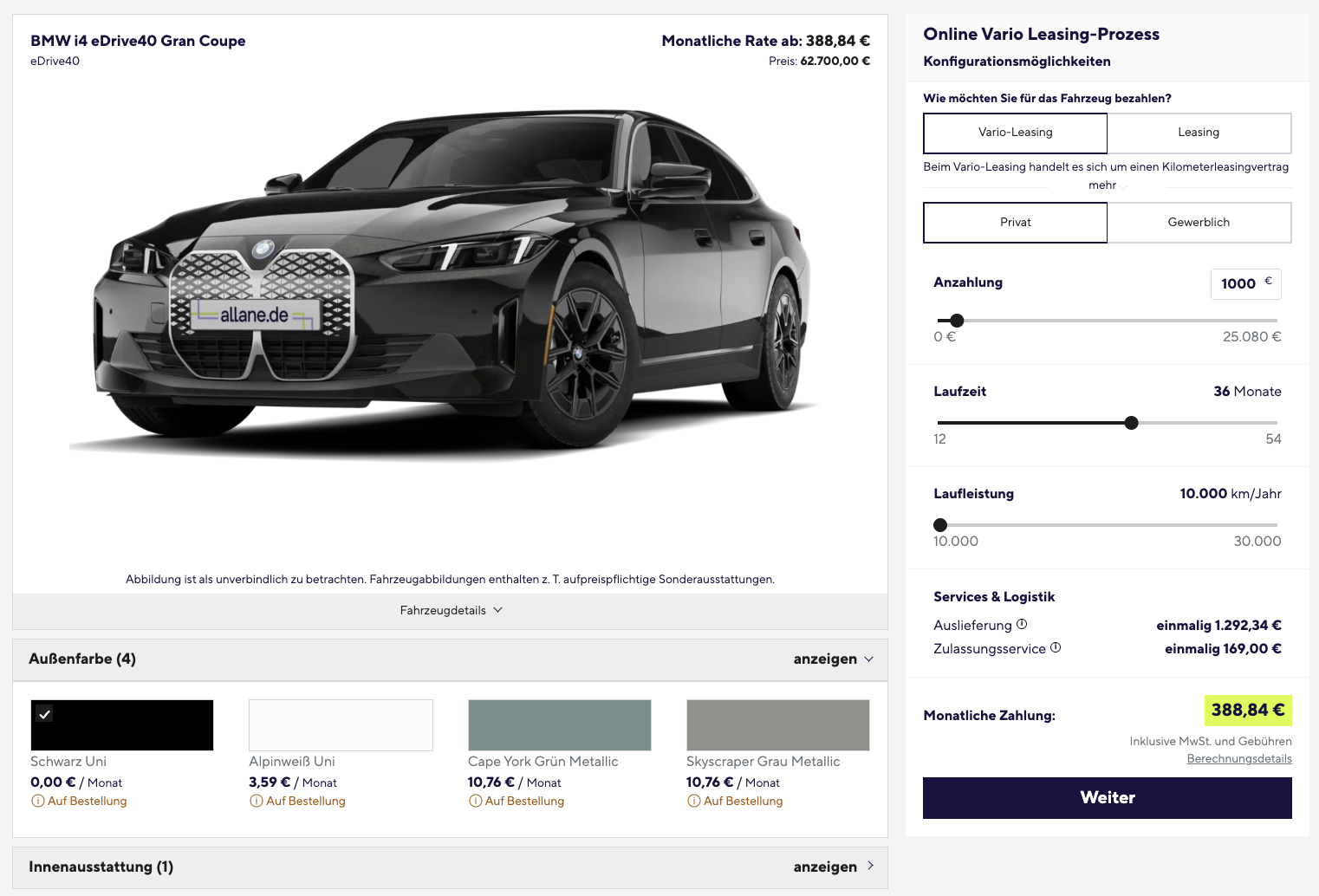 Der BMW i4 bleibt optisch nah an der klassischen BMW-Linie und bringt gleichzeitig einen modernen Elektroantrieb mit. BMW i4 eDrive40 Gran Coupé bei Allane für 388,84 Euro brutto im Monat verbindet 340 PS, hohe Reichweite und flexible Vario-Leasing-Konditionen. Kalkuliert wird mit 1.000 Euro Anzahlung, 36 Monaten Laufzeit und 10,000 Freikilometer pro Jahr.