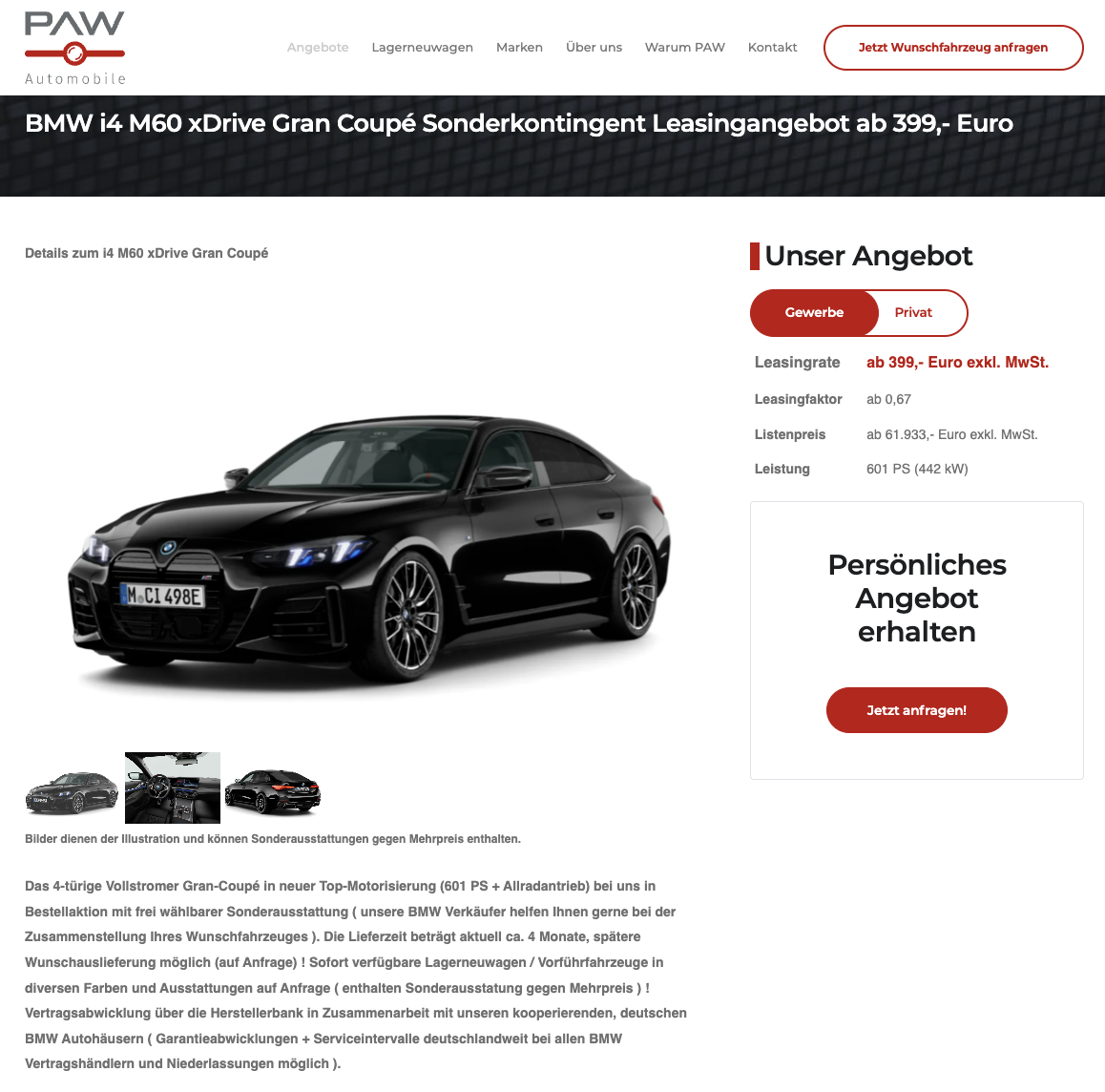 Der BMW i4 ist die Variante für alle, die ein vollelektrisches Fahrzeug möchten, aber keine Lust auf Kompromisse bei Leistung und Fahrdynamik haben. Gleichzeitig bleibt das Gran Coupé im Alltag nutzbar, sowohl beim Platzangebot als auch bei der Reichweite. BMW i4 M60 xDrive Gran Coupé bei PAW Automobile wird im Geschäftsleasing für 399 Euro netto pro Monat angeboten, Privatleasing liegt bei 544 Euro brutto pro Monat. Kalkuliert sind beide Varianten mit 36 Monaten Laufzeit und 5.000 Kilometern pro Jahr, Anpassungen sind möglich. Es handelt sich um ein frei konfigurierbares Bestellfahrzeug mit rund vier Monaten Lieferzeit, eine spätere Wunschauslieferung kann auf Anfrage umgesetzt werden. Zusätzlich sind Lagerneuwagen und Vorführfahrzeuge in verschiedenen Farben und Ausstattungen auf Anfrage verfügbar, Sonderausstattung kann je nach Fahrzeug gegen Mehrpreis enthalten sein.