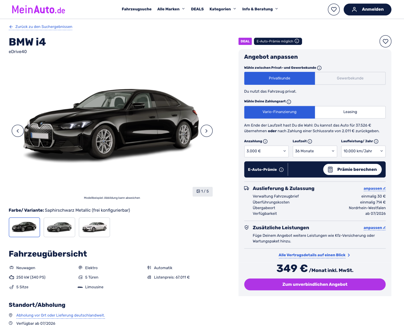 BMW i4 im Vario-Leasing als Bestellfahrzeug für 349 [432] Euro im Monat brutto