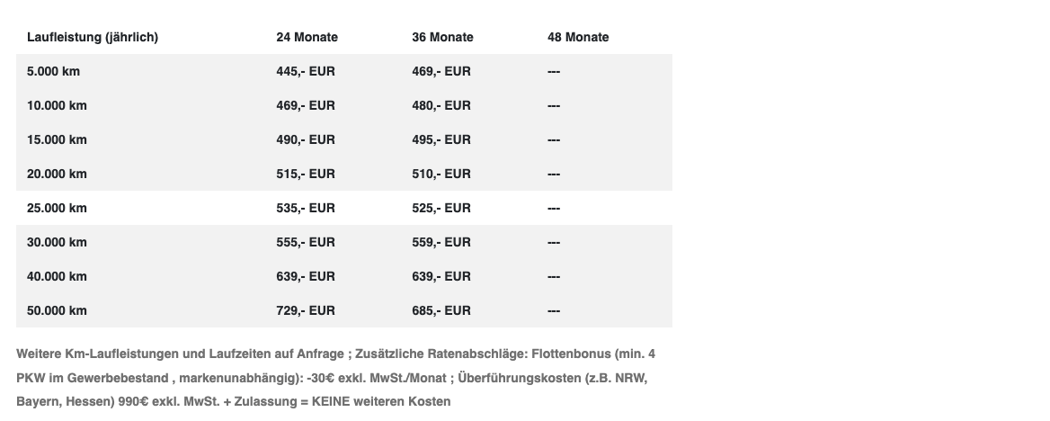Die Konditionen lassen sich anpassen, etwa bei Laufleistung oder Laufzeit. Im Marktvergleich zeigt sich ein deutlicher Unterschied, denn vergleichbare Angebote liegen häufig bei rund 721 Euro netto monatlich. Dieses Angebot bleibt damit spürbar darunter und setzt einen klaren wirtschaftlichen Anreiz.