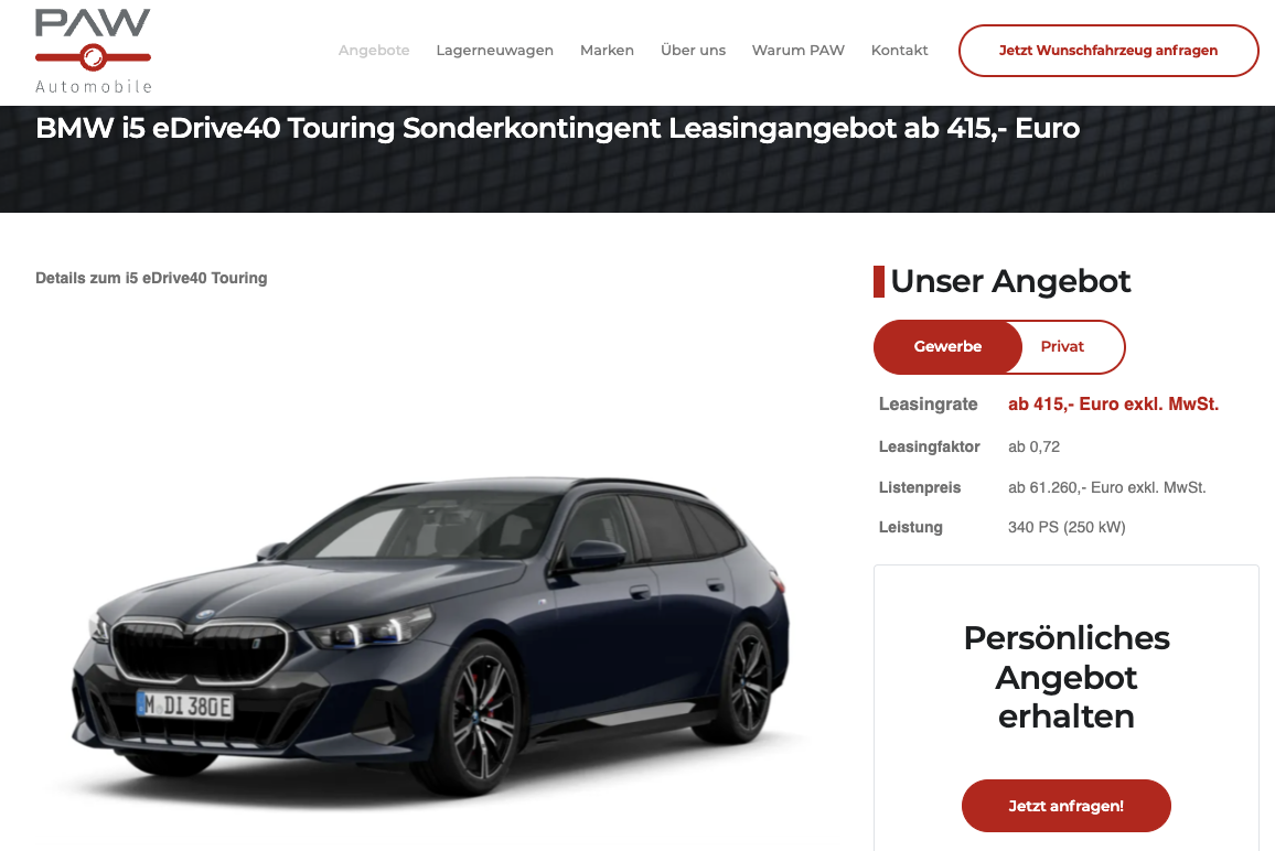 Viel Platz, moderner Elektroantrieb und eine klare Ausrichtung auf den Geschäftsalltag. BMW i5 Touring eDrive40 bei PAW Automobile für 415 Euro netto im Monat spricht vor allem Flottenkunden an. Der Preis berücksichtigt bereits den Flottenbonus von 30 Euro, gültig ab vier Fahrzeugen im Bestand. Die Kalkulation basiert auf 24 Monaten Laufzeit und 5.000 Kilometern jährlich, bei 10.000 Kilometern liegt die Rate bei 469 Euro netto pro Monat. Die Auslieferung ist nach aktuellem Stand in etwa vier Monaten möglich, alternativ stehen vereinzelt auch schneller verfügbare Fahrzeuge bereit, spätester Termin ist September 2026.