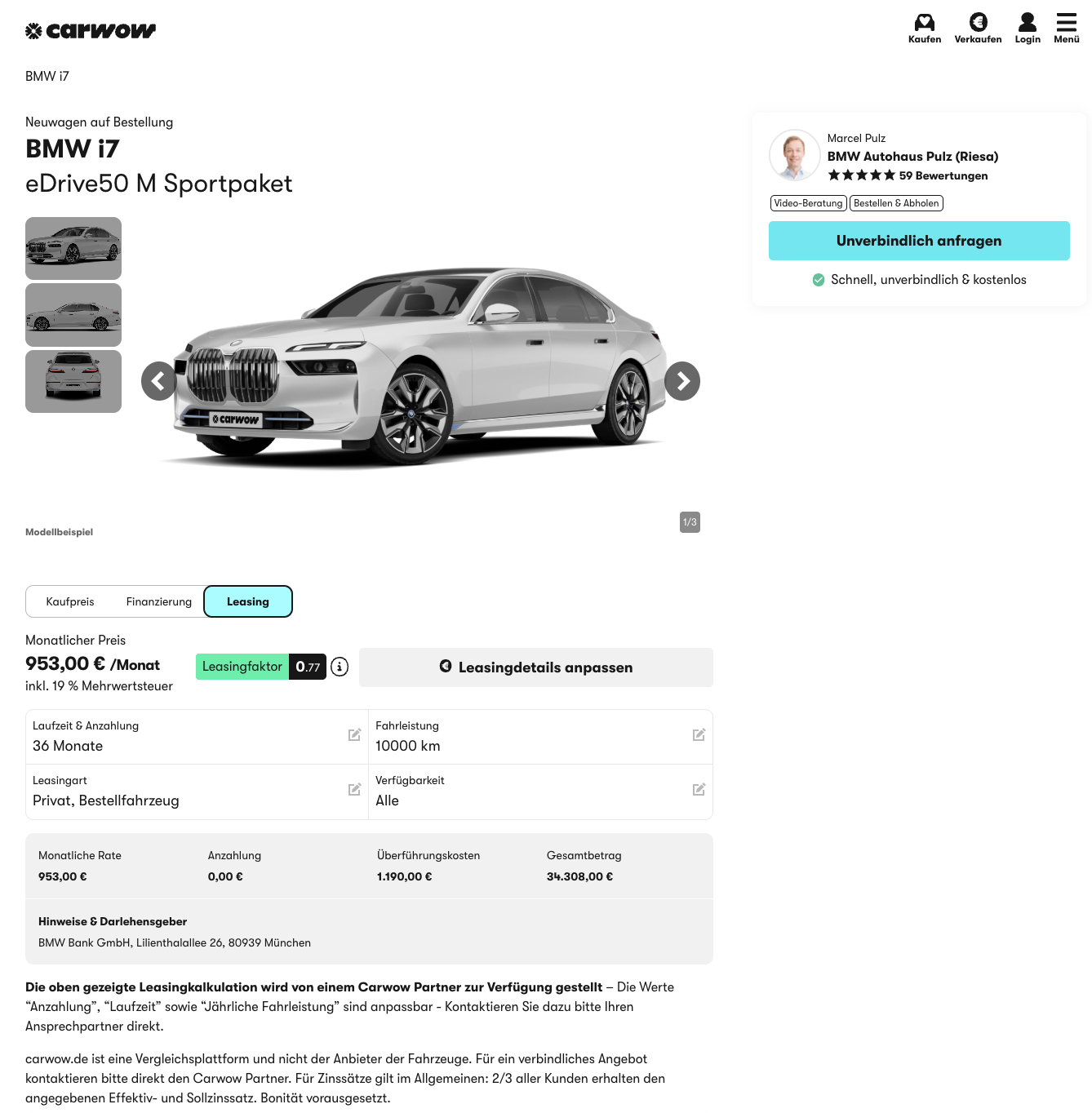 Kalkuliert ist das Angebot mit 36 Monaten Laufzeit und 10.000 Kilometern pro Jahr. Der Vergleich zeigt, warum das Paket auffällt: Der Platzhirsch liegt aktuell bei 1.492 Euro brutto pro Monat für einen i7 eDrive50 mit M Sportpaket, hier steht ihr deutlich darunter, und bekommt dafür elektrische Oberklasse mit einem sportlichen Anzug.