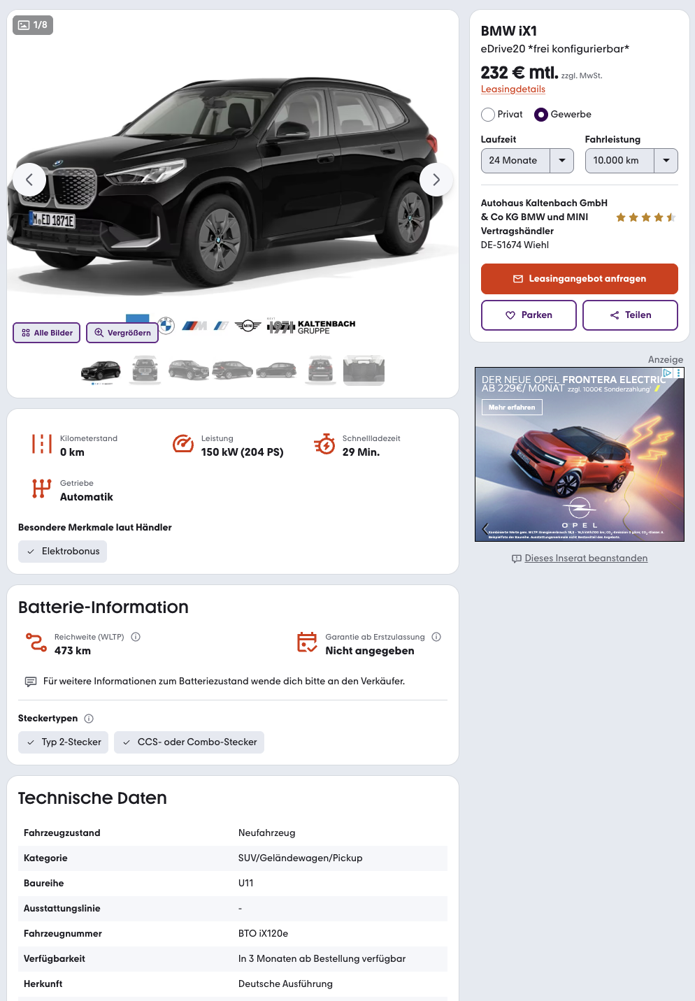 Elektrisch, kompakt, mit echter BMW-Gelassenheit auf Strecke. BMW iX1 eDrive20 bei mobile.de für 232 € netto pro Monat, Privatkunden für 278 € brutto, frei konfigurierbares Bestellfahrzeug, Lieferzeit ca. 3 Monate. Lack, Räder und Pakete wählt ihr nach Geschmack, Premium zum Einstiegspreis, aber ohne Abstriche.