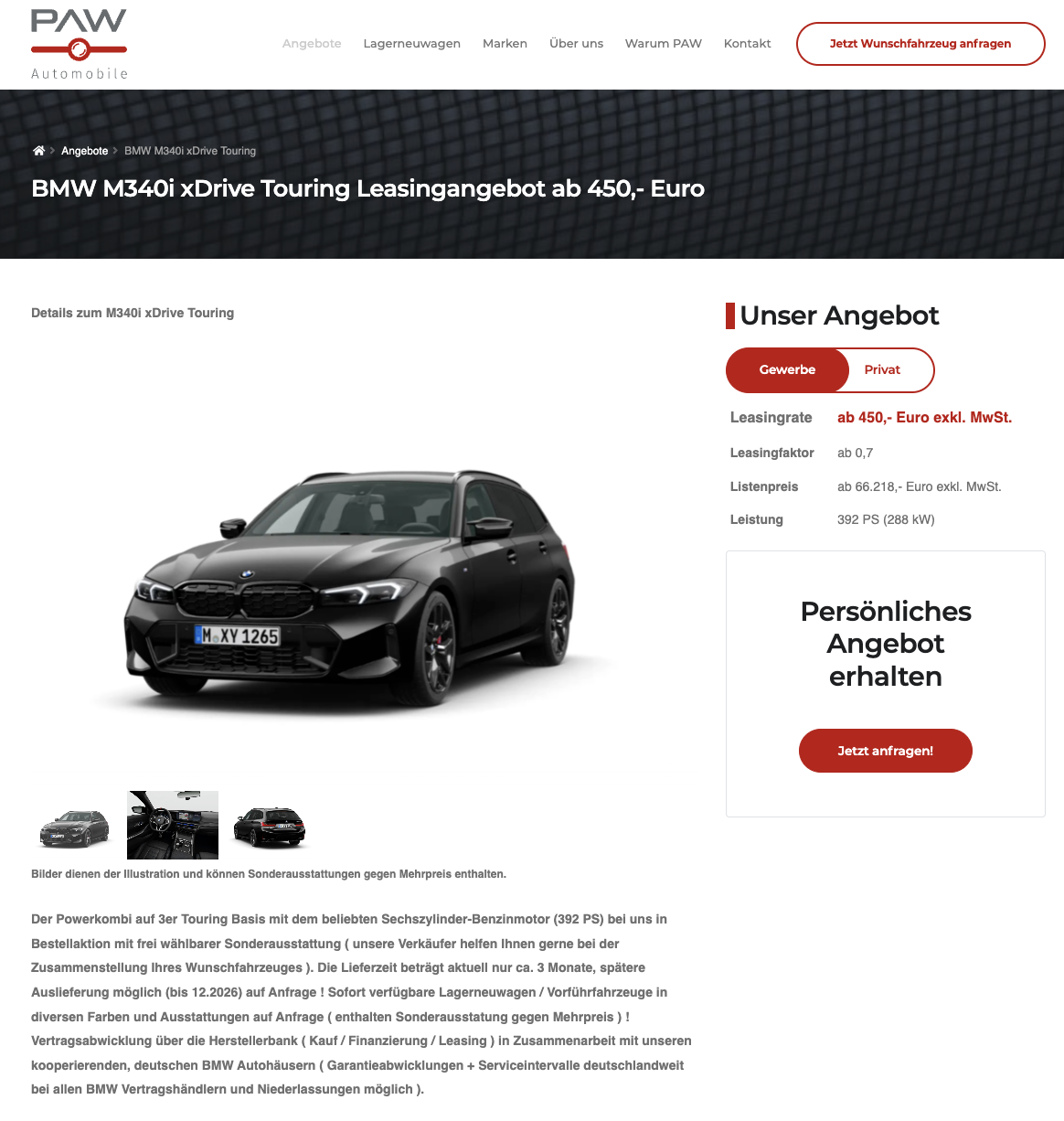 Der BMW 3er ist im Alltag ein vertrautes Bild, auf der Autobahn genauso wie vor dem Büro, genau deshalb wirkt der Schritt zum M340i so spannend, weil er das bekannte Format plötzlich deutlich schärfer zeichnet. BMW M340i xDrive Touring bei PAW Automobile für 450 Euro netto im Monat ist als Business Leasing kalkuliert und trifft damit genau die Zielgruppe, die Performance möchte, aber den Kombi als Werkzeug braucht. Der Preis gilt mit Flottenrabatt von 30 Euro, sobald ein Fuhrpark mit mehr als vier Fahrzeugen vorhanden ist. Ohne diesen Rabatt liegt die Rate für Geschäftskunden bei 480 Euro netto, Privatkunden kommen auf 615 Euro brutto pro Monat. Damit steht die Kondition sauber da, ohne graue Zone, ohne Rechentricks.