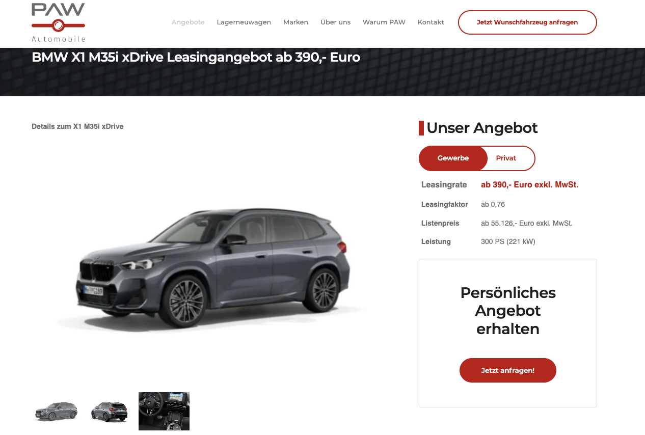 Der BMW X1 M35i xDrive ist keine Spielerei im Kompakt-SUV-Segment, sondern die sportlichste Auslegung des X1, sauber positioniert zwischen Alltag, Premiumanspruch und spürbarer Dynamik. BMW X1 M35i xDrive bei PAW Automobile für 390 Euro netto im Monat richtet sich an Geschäftskunden, die ein leistungsstarkes SUV mit hochwertiger Ausstattung und klar kalkulierbaren Konditionen suchen. Der bereits eingerechnete Flottenbonus gilt für Unternehmen mit mindestens vier Fahrzeugen im Bestand, markenunabhängig. Angeboten wird ein frei konfigurierbares Bestellfahrzeug mit rund vier Monaten Lieferzeit. Auf Anfrage sind auch spätere Auslieferungen bis März 2027 möglich, zudem stehen vereinzelt Lagerneuwagen und Vorführfahrzeuge in unterschiedlichen Farben und Ausstattungen bereit. Für Privatkunden startet das Leasing bei 519 Euro brutto pro Monat.