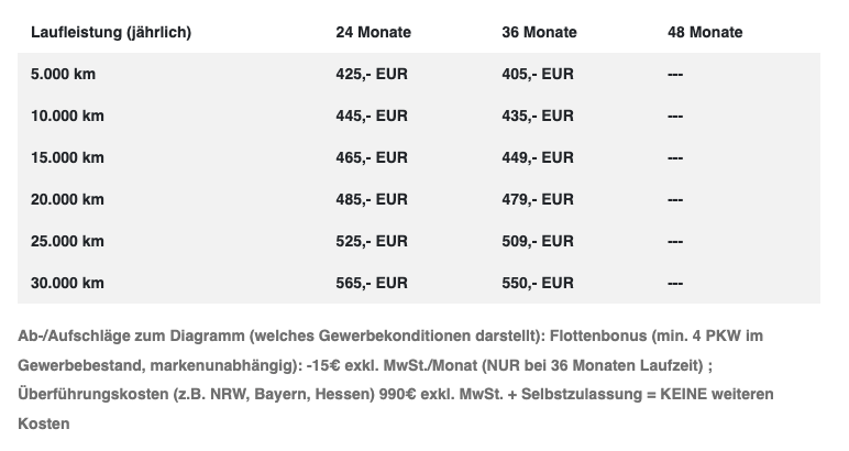 Die Kalkulation basiert auf 36 Monaten Laufzeit und 5.000 Kilometern pro Jahr. Bei 10.000 Kilometern jährlich liegt die Rate bei 435 Euro netto pro Monat. Damit entsteht ein Angebot, das Leistung, Premiumanspruch und Nutzwert in einer Form verbindet, die im Segment auffällig stark wirkt.