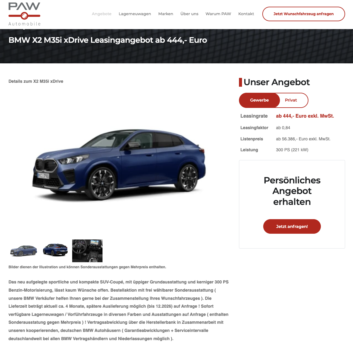 BMW X2 M35i xDrive im Business-Leasing, kompakt, kräftig, hochwertig. Der BMW X2 M35i xDrive bei PAW Automobile für 444 Euro netto im Monat macht genau das und verbindet sportliche Fahrleistungen mit einem Format, das im Alltag weiterhin gut nutzbar bleibt. Die Kalkulation gilt für Geschäftskunden und berücksichtigt bereits eine Flottenprämie von 15 Euro, die für Unternehmen mit mindestens vier Fahrzeugen im Bestand greift, unabhängig von der Marke. Angeboten wird ein frei konfigurierbares Bestellfahrzeug mit einer Lieferzeit von rund vier Monaten. Auf Anfrage sind auch spätere Auslieferungen bis Dezember 2026 möglich. Zusätzlich können Lagerfahrzeuge und Vorführwagen in unterschiedlichen Konfigurationen verfügbar sein.