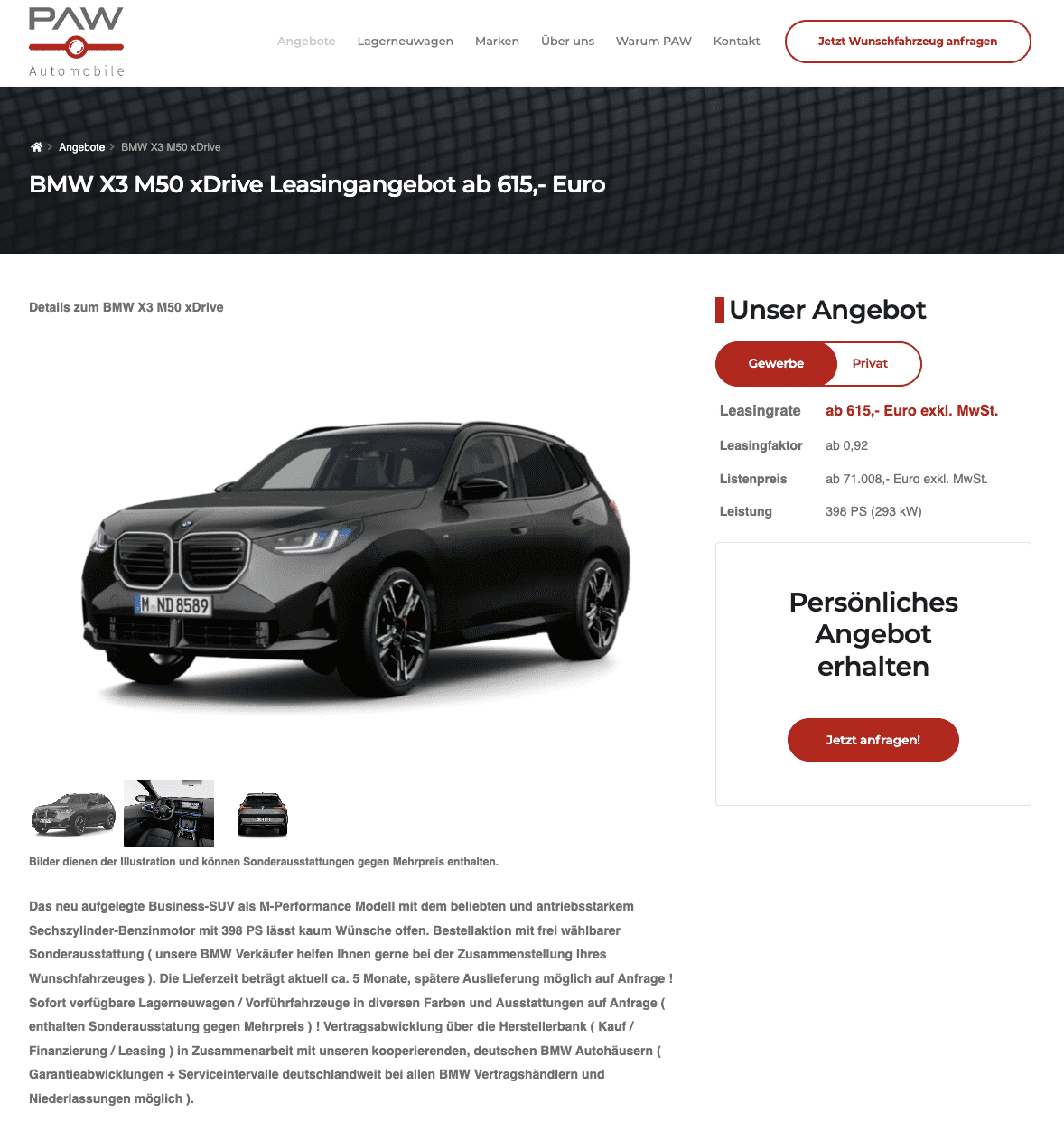 Hier rollt kein braver Familienwagen vor, sondern ein SUV, das nach Sportwagen klingt und fährt. Der BMW X3 M50 xDrive ist die Speerspitze der X3-Baureihe und bei PAW Automobile schon ab 615 Euro netto im Monat für Geschäftskunden zu haben. Privatkunden zahlen ab 815 Euro brutto. Klingt fair? Ist es auch, denn beim Marktführer ruft man satte 800 Euro netto auf. Dazu gibt es frei konfigurierbare Bestellfahrzeuge mit rund fünf Monaten Lieferzeit oder auf Anfrage sogar sofort verfügbare Lager- und Vorführmodelle.