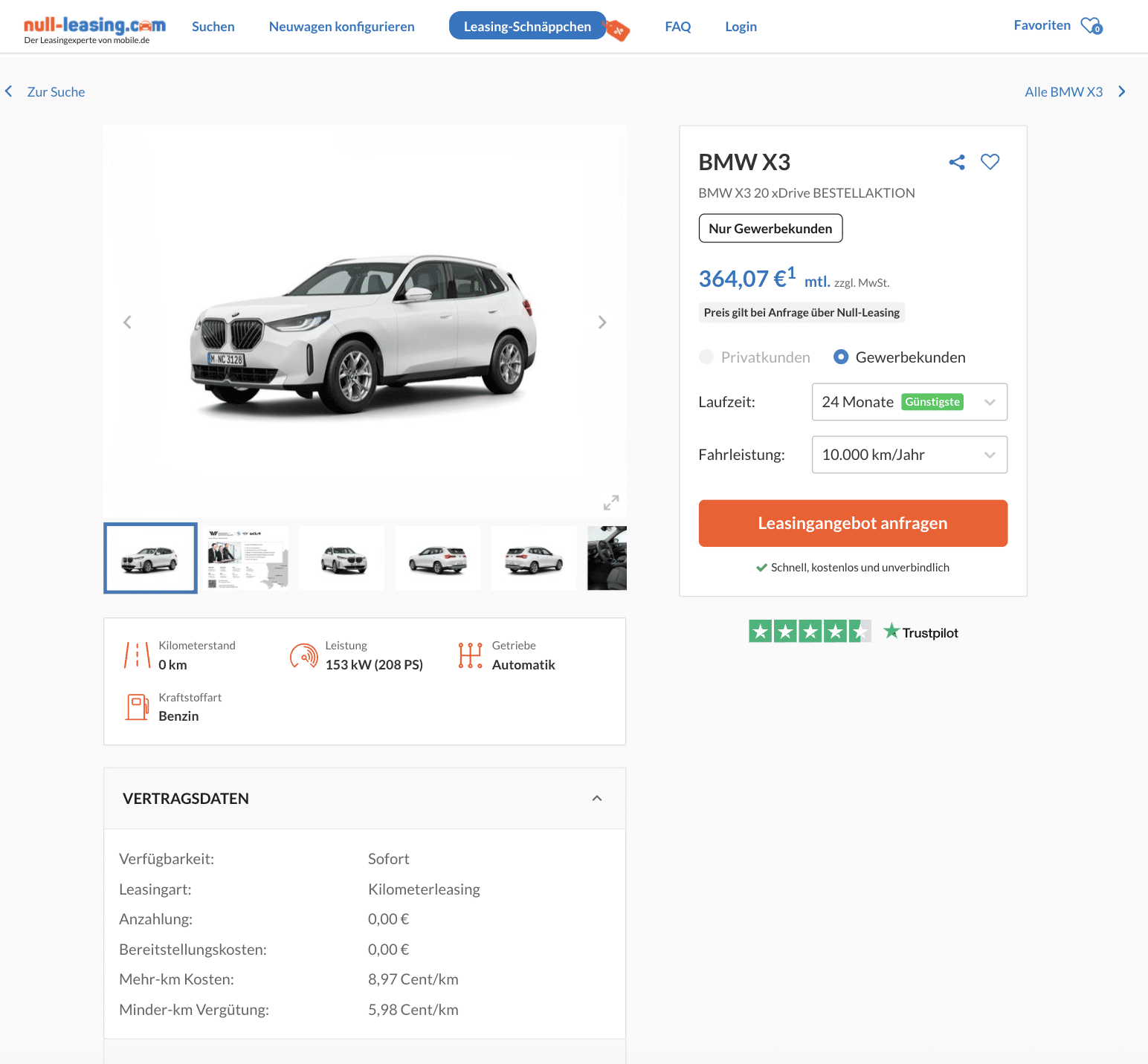 Bei Null-Leasing bekommt ihr den BMW X3 xDrive20 AT als sofort verfügbaren Neuwagen in Alpinweiß für 364 Euro netto pro Monat. Geschäftskunden steigen ohne Wartezeit ein, konfigurieren nur noch Kleinigkeiten wie Laufzeit und Kilometer und rollen direkt mit einem Premium-SUV vom Hof, das im Alltag genauso glänzt wie beim Kundentermin.