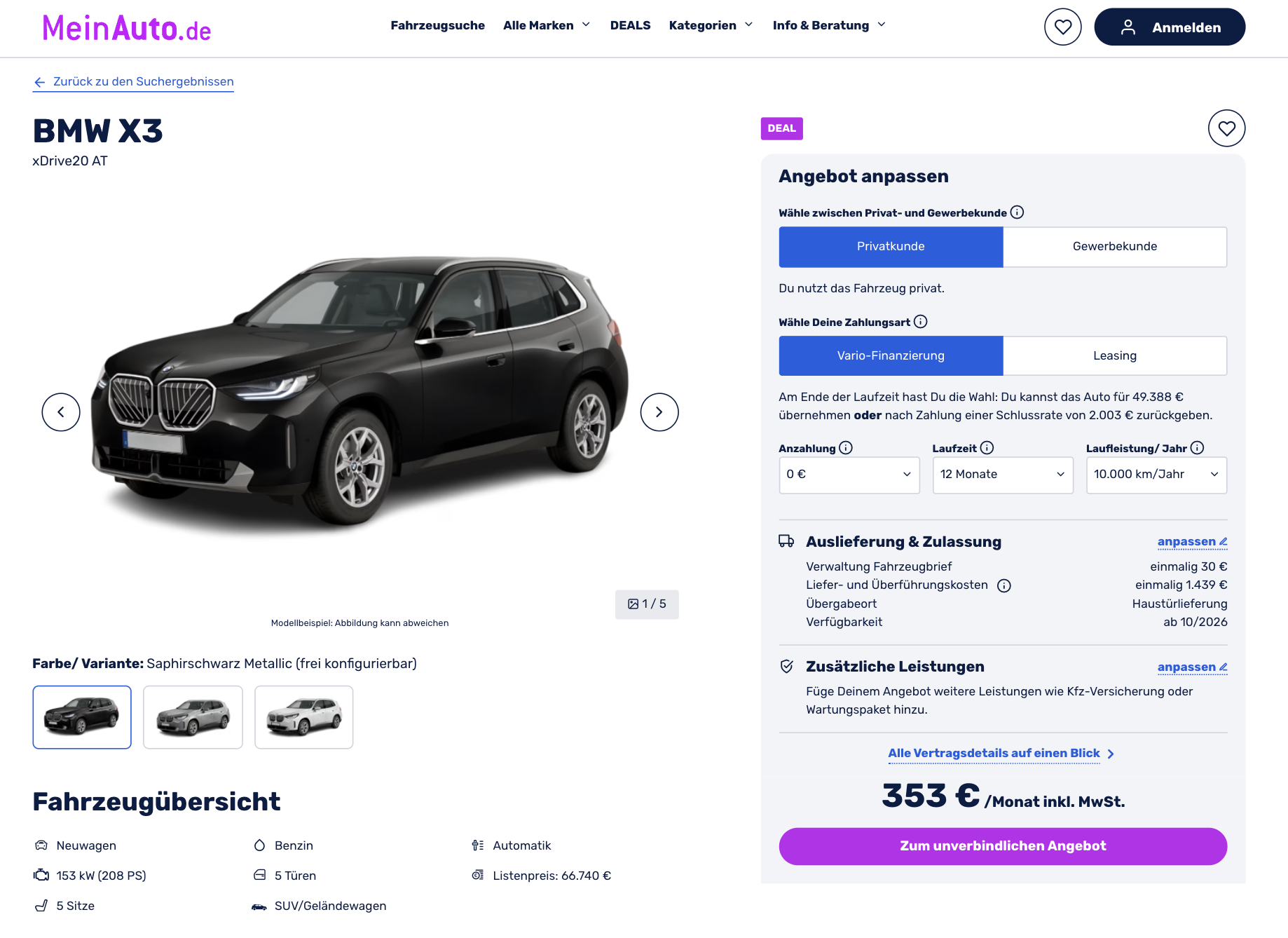 Der BMW X3 ist ein Mittelklasse-SUV, das auf Komfort, ruhige Souveränität und moderne Technik setzt. BMW X3 xDrive20 AT bei MeinAuto für 353 Euro brutto im Monat, kalkuliert als 12-Monats-Leasing mit 10.000 Kilometern pro Jahr. Es handelt sich um ein frei konfigurierbares Bestellfahrzeug, das bereits sinnvoll vorkonfiguriert ist. Die Auslieferung ist für Oktober 2026 vorgesehen.