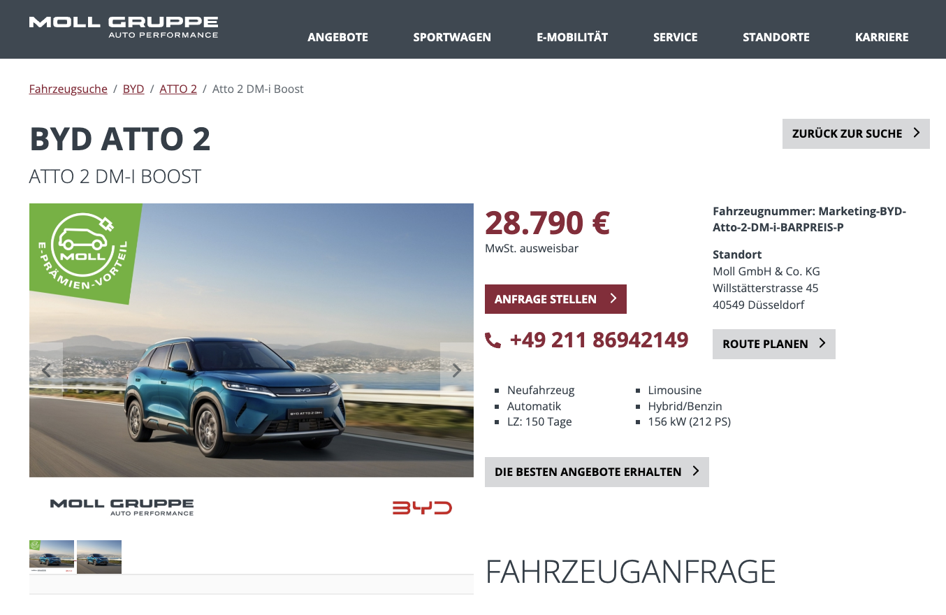 Der BYD ATTO 2 setzt nicht auf Effekthascherei, sondern auf ein Konzept, das im Alltag nachvollziehbar funktioniert. BYD ATTO 2 DM i Boost beim Autohaus Moll für 28.790 Euro brutto bringt moderne Hybridtechnik, eine umfangreiche Ausstattung und kompakte SUV Maße in ein Paket, das vor allem preislich interessant wirkt. Es handelt sich um ein Bestellfahrzeug, die Lieferzeit liegt bei rund fünf Monaten. Wichtig für die Kalkulation, zum Fahrzeugpreis kommen 1.300 Euro Überführungskosten hinzu, die Zulassung übernimmt das Autohaus dafür kostenlos.