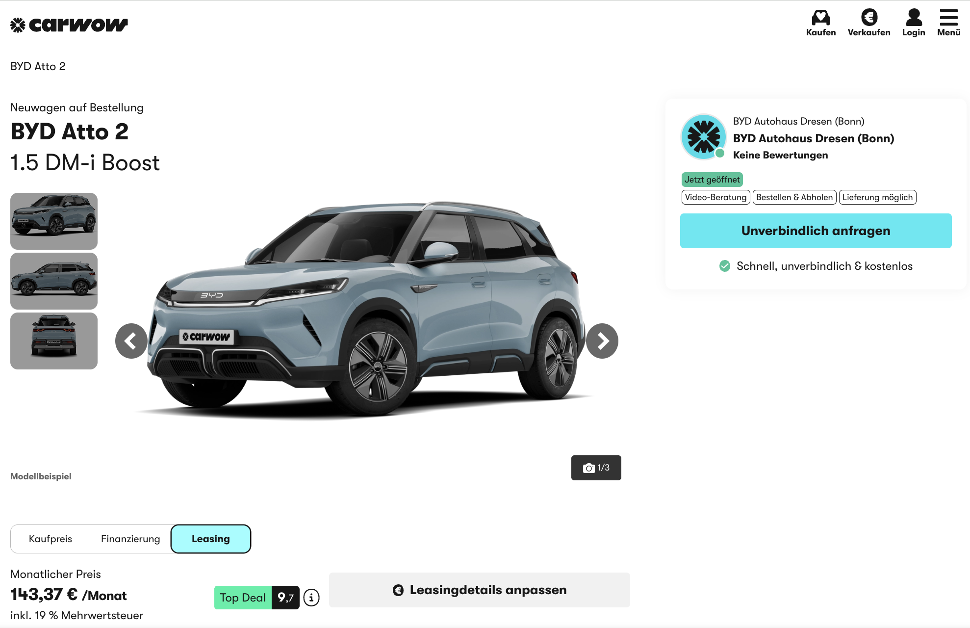 Ein kompaktes SUV mit Plug-in-Hybridtechnik für eine Rate, die sofort ins Auge fällt. BYD ATTO 2 1.5 DM-i Boost bei carwow für 143,37 Euro brutto im Monat richtet sich an Privatkunden und wird mit einer Umweltprämie von 4.000 Euro kalkuliert. Wird diese Sonderzahlung sauber auf die Laufzeit verteilt, ergibt sich eine normalisierte Rate von 226,70 Euro brutto. Damit bleibt der Deal transparent, auch wenn die Prämie je nach Voraussetzungen ganz oder teilweise erstattet wird.