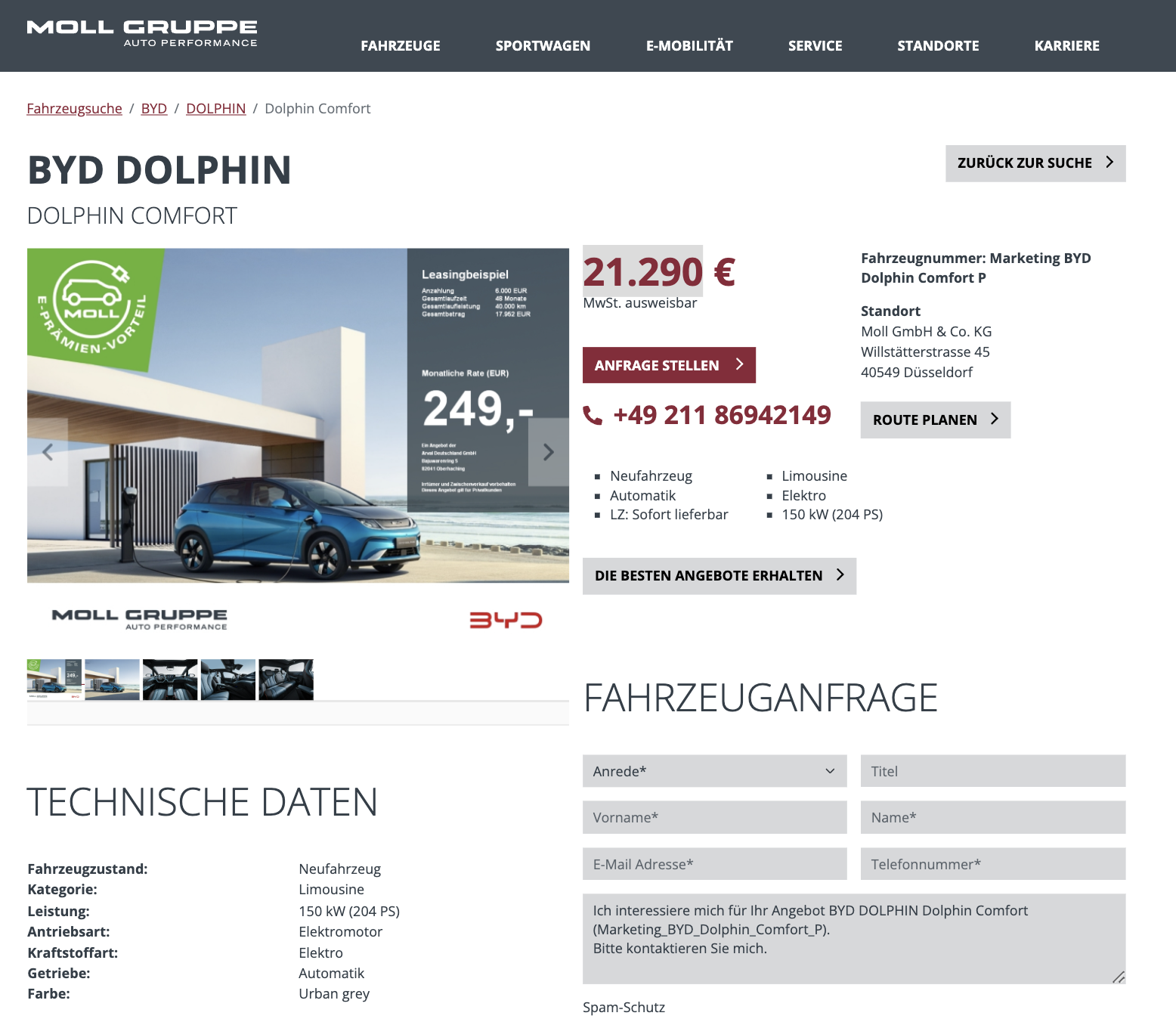 Praktischer Elektro-Kleinwagen mit starker Motorisierung, BYD Dolphin 150 kW Comfort beim Autohaus Moll für 21.290 Euro brutto kaufen. Das Fahrzeug ist sofort verfügbar und wird in Urban Grey angeboten. Wichtig für die Planung, der Deal ist bis 31.03.2026 gültig und setzt eine Zulassung bis spätestens 30.06.2026 voraus. Wer ein E-Auto für Stadt und Pendelstrecke sucht und dabei den Kaufpreis im Blick hat, bekommt hier eine sehr klare Ansage.