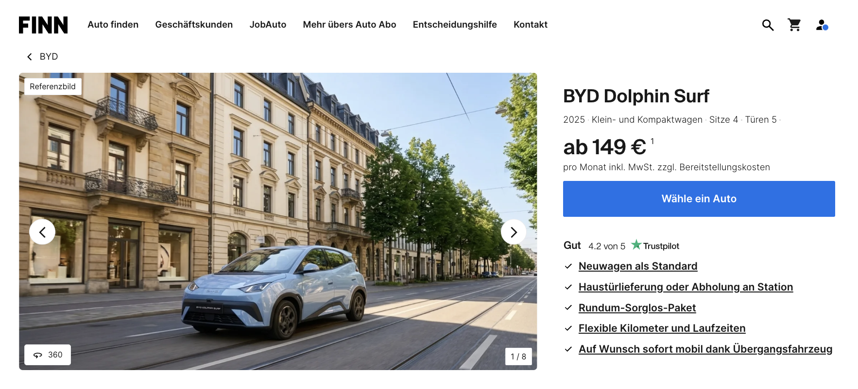 BYD Dolphin Surf, E-Abo für alle, die Mobilität einfach halten wollen. Der BYD Dolphin Surf 43,2 kWh Boost bei FINN für 149 Euro brutto im Monat richtet sich an alle, die einen elektrischen Kleinwagen suchen, aber weder Kauf, klassisches Leasing noch lange Bindung wollen. Stattdessen steht hier ein Auto-Abo im Mittelpunkt, das vor allem durch Klarheit punktet. Der Wagen ist ab dem 04.05.2026 verfügbar und passt damit gut zu allen, die planbar in die Elektromobilität einsteigen möchten.