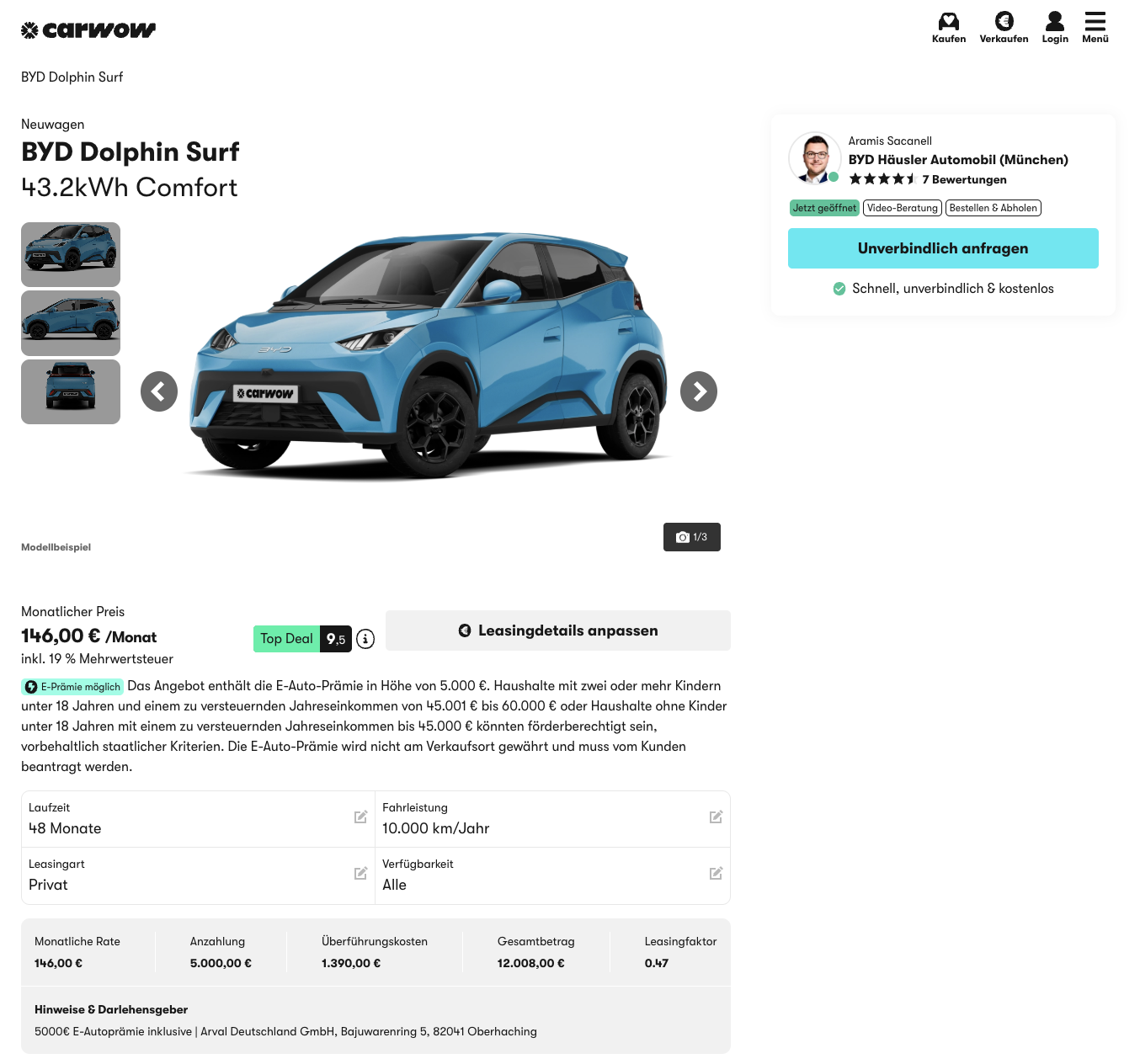 Das Angebot basiert auf 48 Monaten und 10.000 Kilometern pro Jahr. Mit 146 Euro brutto monatlich und transparenter Normalisierung über die Umweltprämie positioniert sich dieses BYD Dolphin Surf Leasing als klar kalkulierter Einstieg in die Elektromobilität.