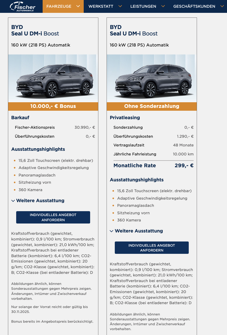 Bei Fischer Automobile gibt es den BYD Seal U DM-i Boost als Kaufdeal für 30.990 Euro brutto, inklusive Überführungskosten und als frei konfigurierbares Bestellfahrzeug. Die unverbindliche Preisempfehlung liegt bei 40.990 Euro, ihr spart also 10.000 Euro und damit rund 24 Prozent Rabatt auf ein vollwertiges Plug-in-Hybrid-SUV der Mittelklasse. Das Angebot gilt nur solange der Vorrat reicht oder bis zum 30.11.2025.