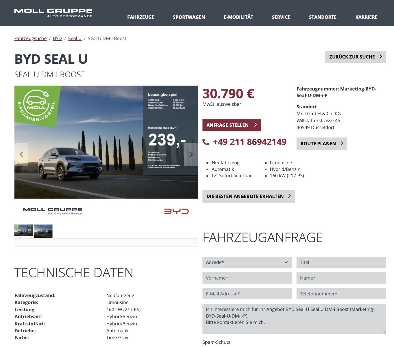 Der BYD Seal U ist ein Plug-in-Hybrid-SUV, das auf elektrische Alltagstauglichkeit und hohe Gesamtreichweite ausgelegt ist. BYD Seal U DM-i Boost beim Autohaus Moll für 30.790 Euro brutto wird hier als sofort verfügbarer Lagerwagen in der Farbe Time Gray angeboten.