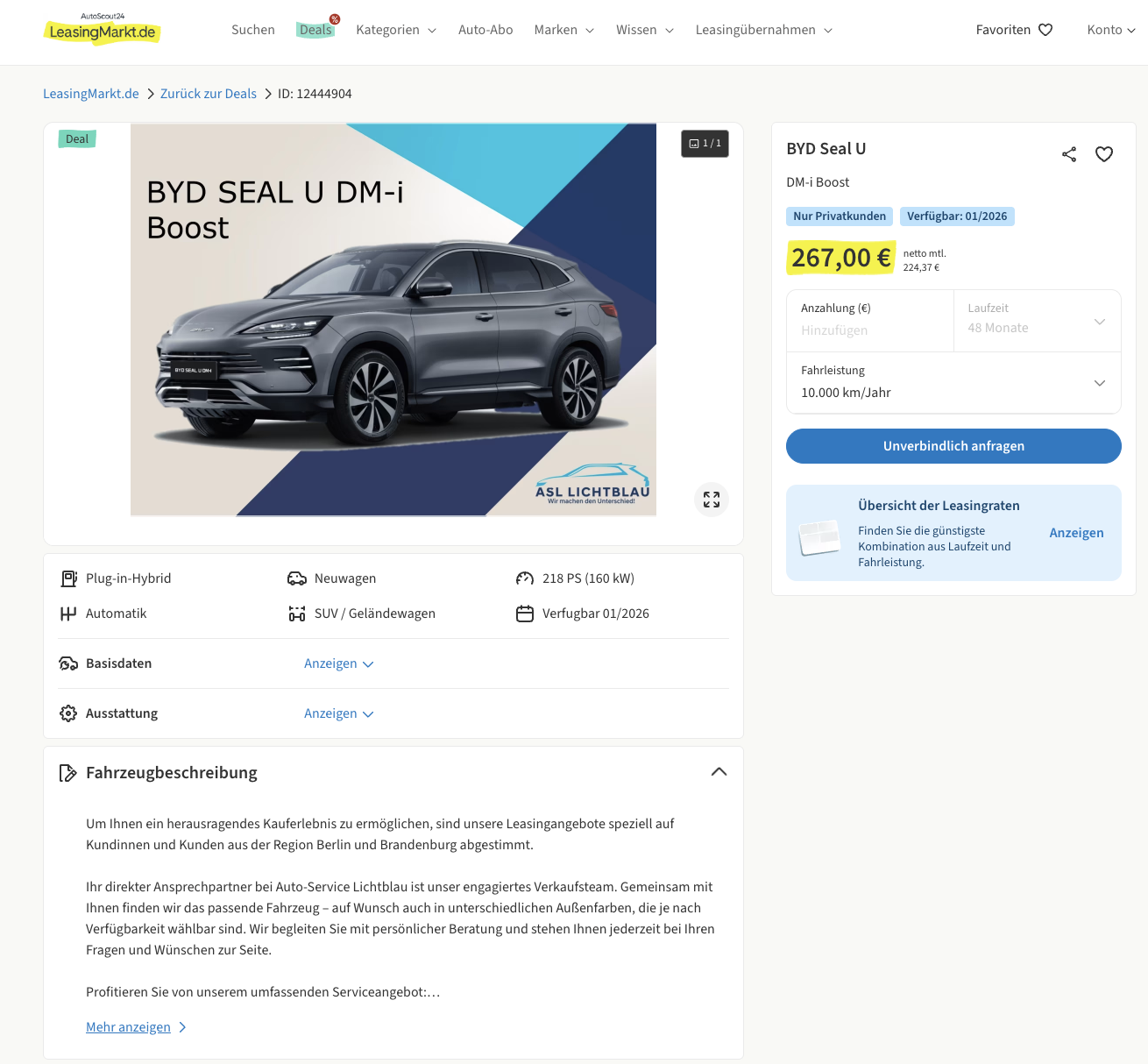 Wer ein modernes Plug-in-SUV fahren möchte, ohne den Fuhrpark auf den Kopf zu stellen, liegt beim BYD Seal U DM-i richtig. Bei LeasingMarkt bekommt ihr den Seal U DM-i im Privatleasing für 267 Euro brutto im Monat, es handelt sich um ein bereits bestelltes Vorlauffahrzeug, das ab Januar 2026 bereitstehen soll. Die Abholung ist in Berlin vorgesehen. Hinterlegt ist eine Laufzeit von 48 Monaten bei 10.000 Kilometern pro Jahr, auf Wunsch kann das Profil angepasst werden, wenn ihr mehr oder weniger fahrt.