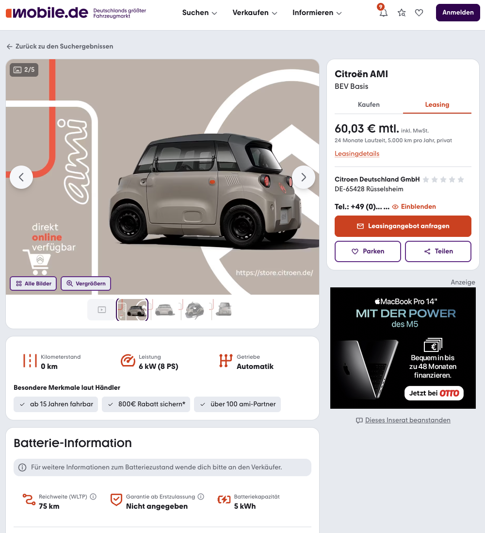 Citroën AMI im Leasing als Vorlauffahrzeug für 60 Euro im Monat brutto