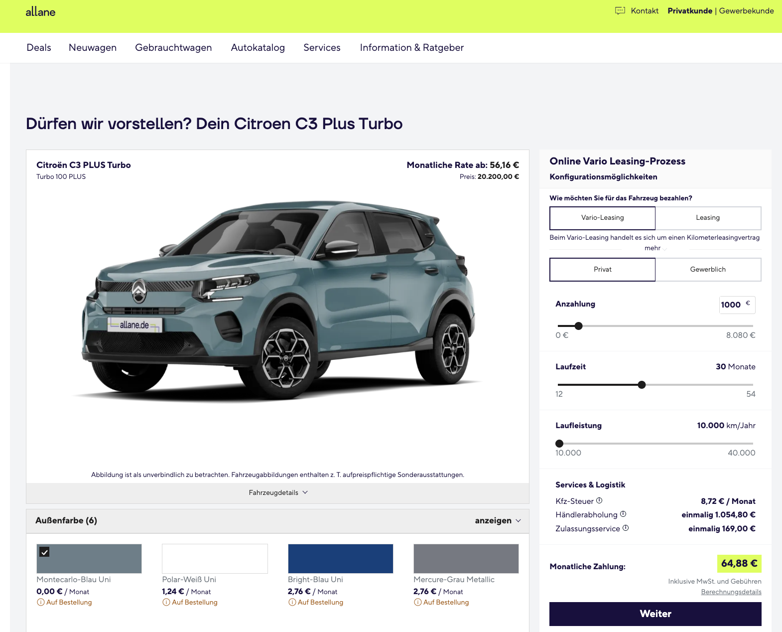 Der Citroën C3 ist ein Kleinwagen für alle, die im Alltag vor allem eine einfache, bezahlbare und trotzdem moderne Lösung suchen. Citroën C3 PureTech Turbo 100 PLUS bei MeinAuto für 65 Euro brutto im Monat, damit gehört dieses Angebot ganz klar zu den auffällig günstigen Deals im aktuellen Markt. Gerechnet wurde mit 1.000 Euro Sonderzahlung, verfügbar ist der C3 in Montecarlo-Blau Uni, weitere Farben sind gegen Aufpreis möglich. Das Besondere an diesem Modell ist das flexible Vario-Leasing. Nach der Laufzeit bleibt die Entscheidung offen, denn der Wagen kann entweder für 13.534 Euro übernommen oder gegen eine Schlussrate von 606 Euro zurückgegeben werden. Rechnet man die Sonderzahlung sauber auf die Laufzeit um, ergibt sich eine normalisierte Rate von 98,33 Euro brutto pro Monat, was das Angebot deutlich realistischer einordnet.